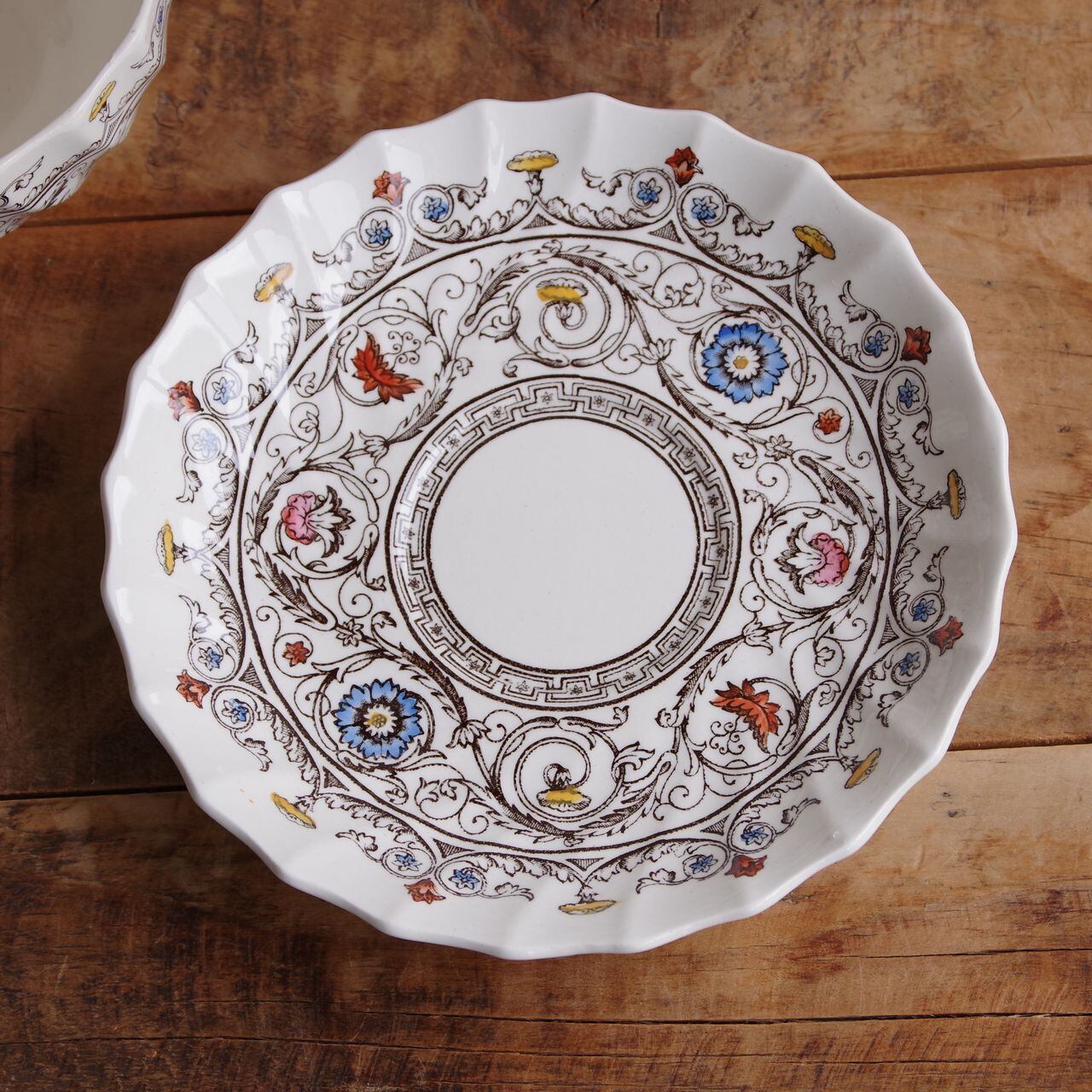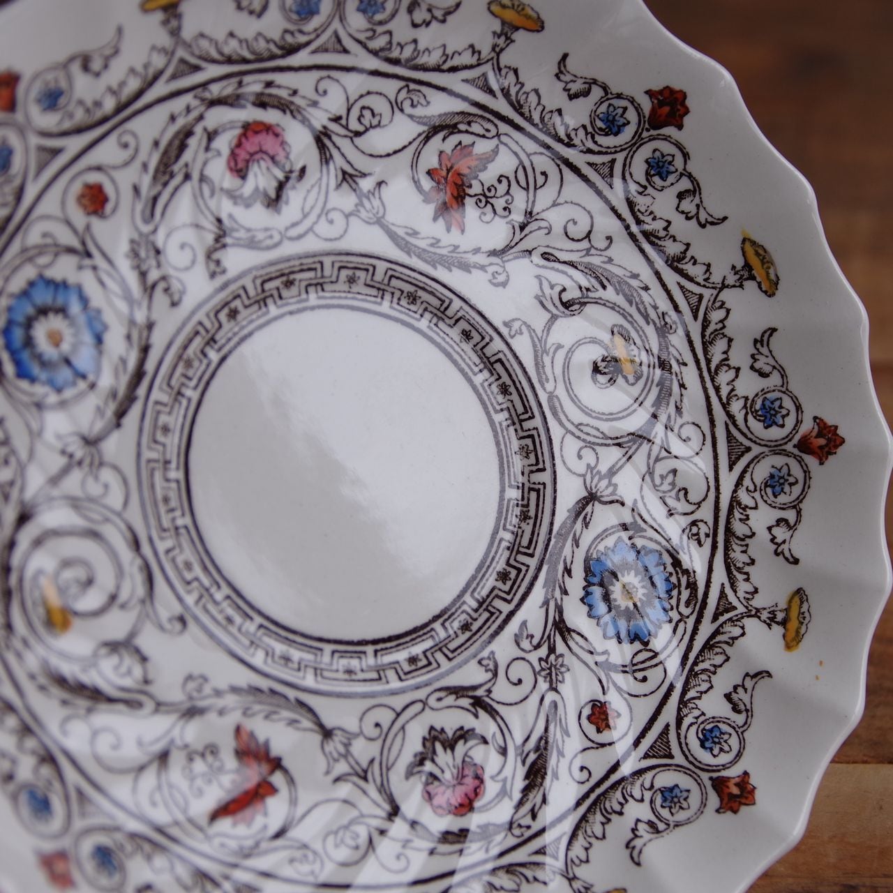 中世の建物の装飾に見られるような、植物の絵柄がモチーフになっており、花の部分にブルーやピンク、赤、黄色の彩色がされています。