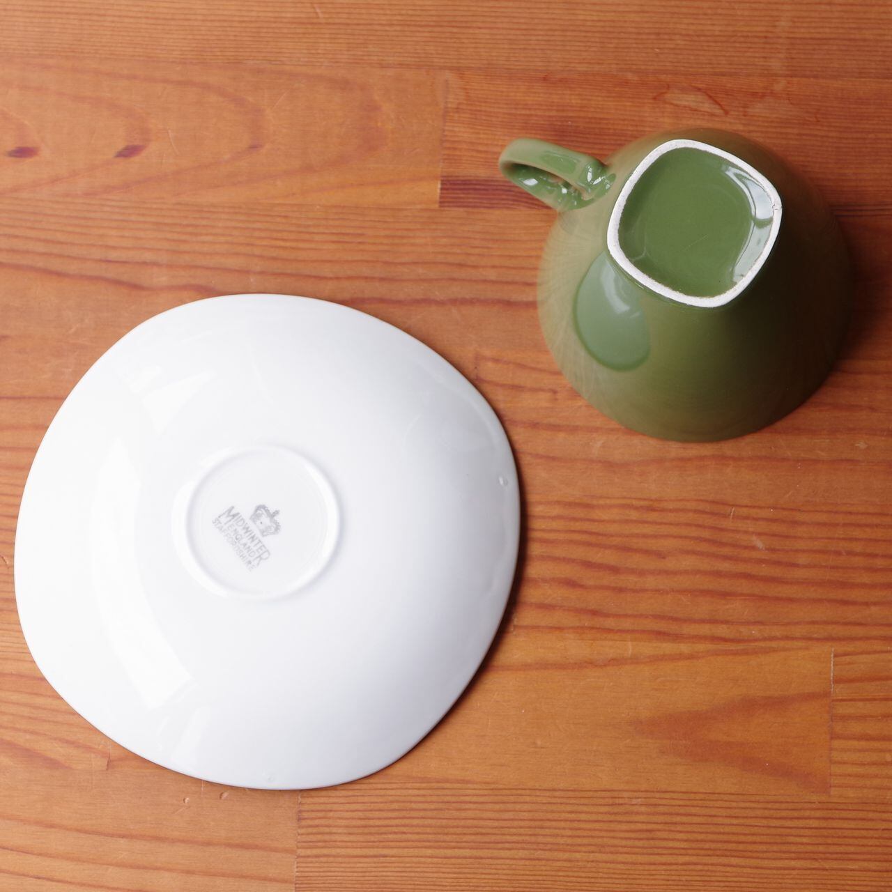 カップは外側の面がグリーン色に塗られており、飲み口の部分は丸い形ですが、底面は四角い形になっています。