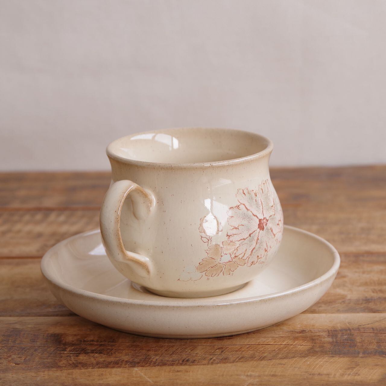 丸みのあるかわいらしい形のカップで、サンドベージュの地に、マーガレットのような花の絵柄が入っています。