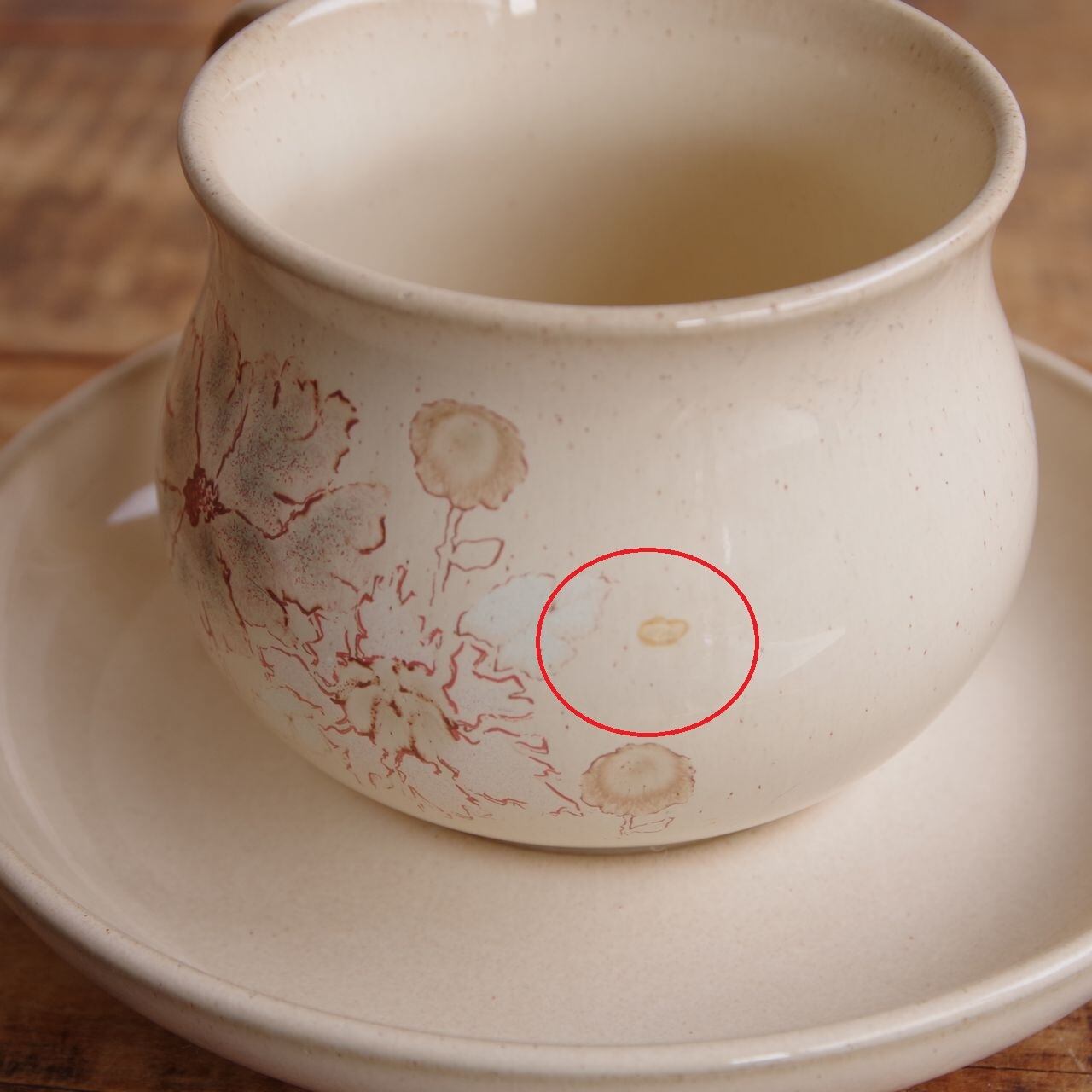 ソーサーのふちやカップの底面に近い箇所に、カトラリーなどの跡か、小さく黒っぽい汚れがついている箇所があります。