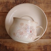 丸みのあるかわいらしい形のカップで、サンドベージュの地に、マーガレットのような花の絵柄が入っています。