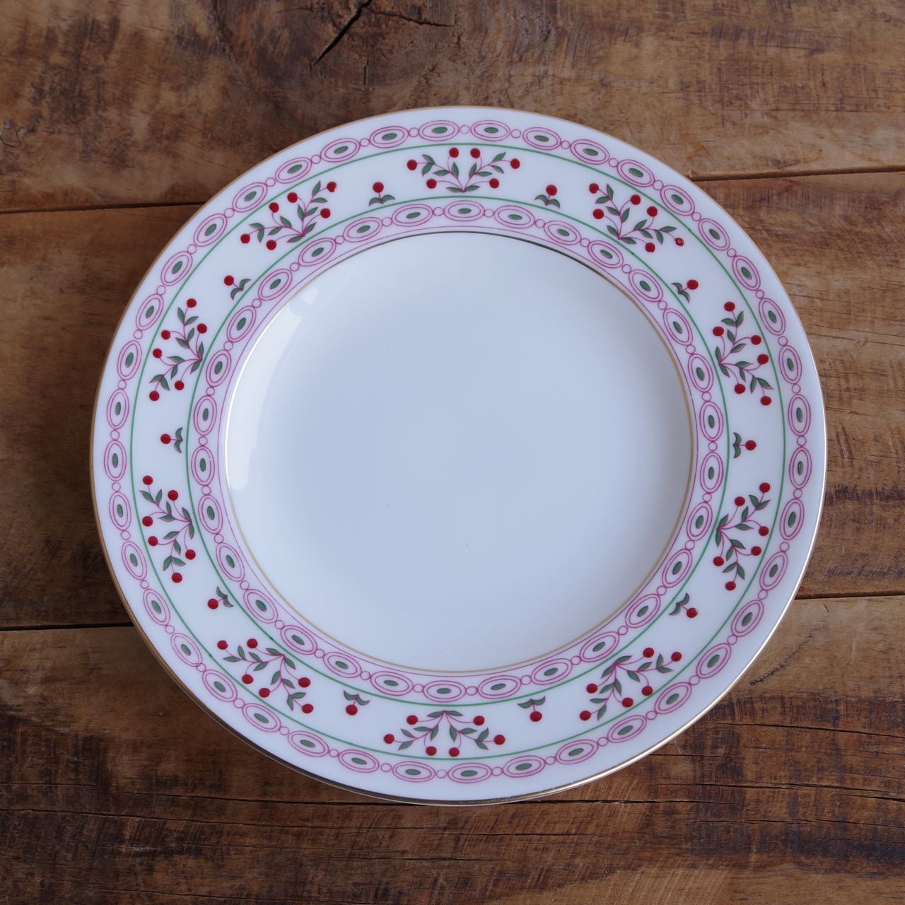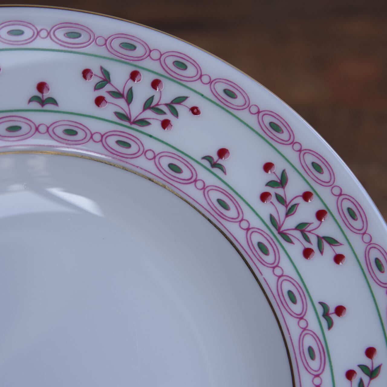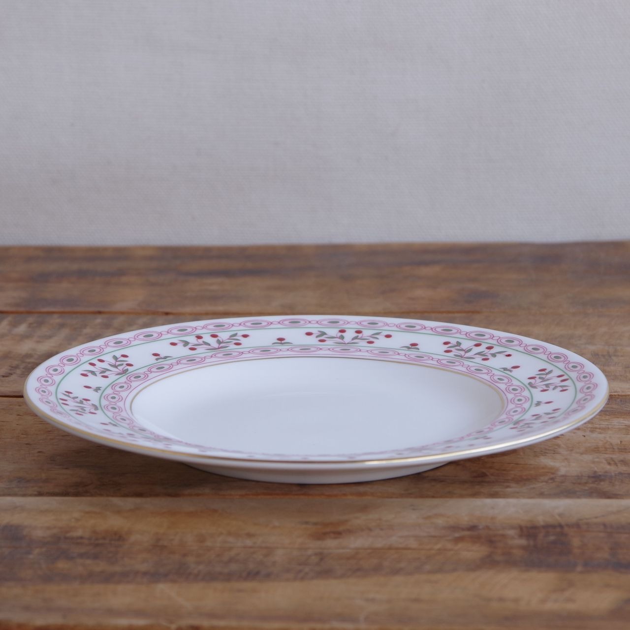 リム部分にピンク色の楕円形の模様が規則的に並び、赤い実か花をつけた枝が描かれています。