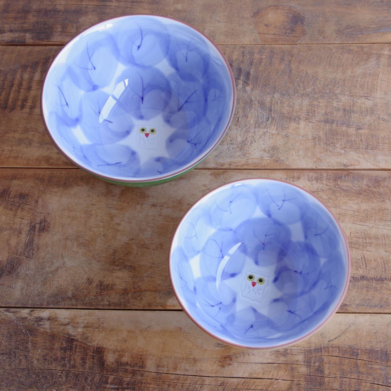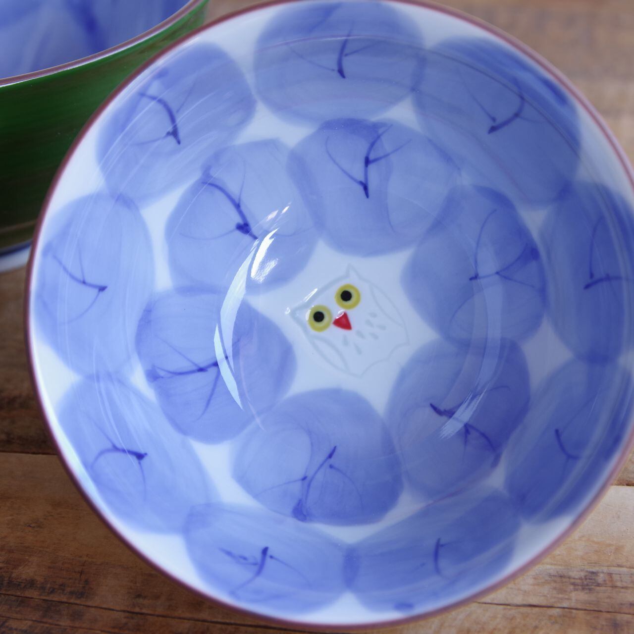 内側にはそれぞれ、ブルーで木の葉のような、木のような絵柄が描かれ、中央にどんぐりまなこのフクロウが描かれています。