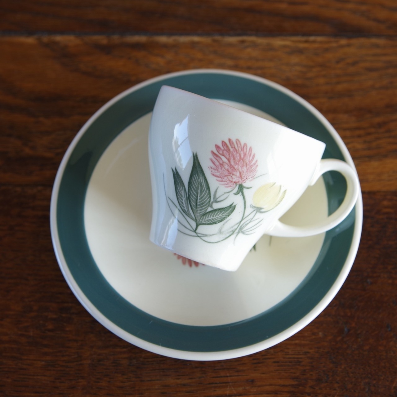 カップのふちやソーサーのリムには、グリーン色の太めのラインが入っています。