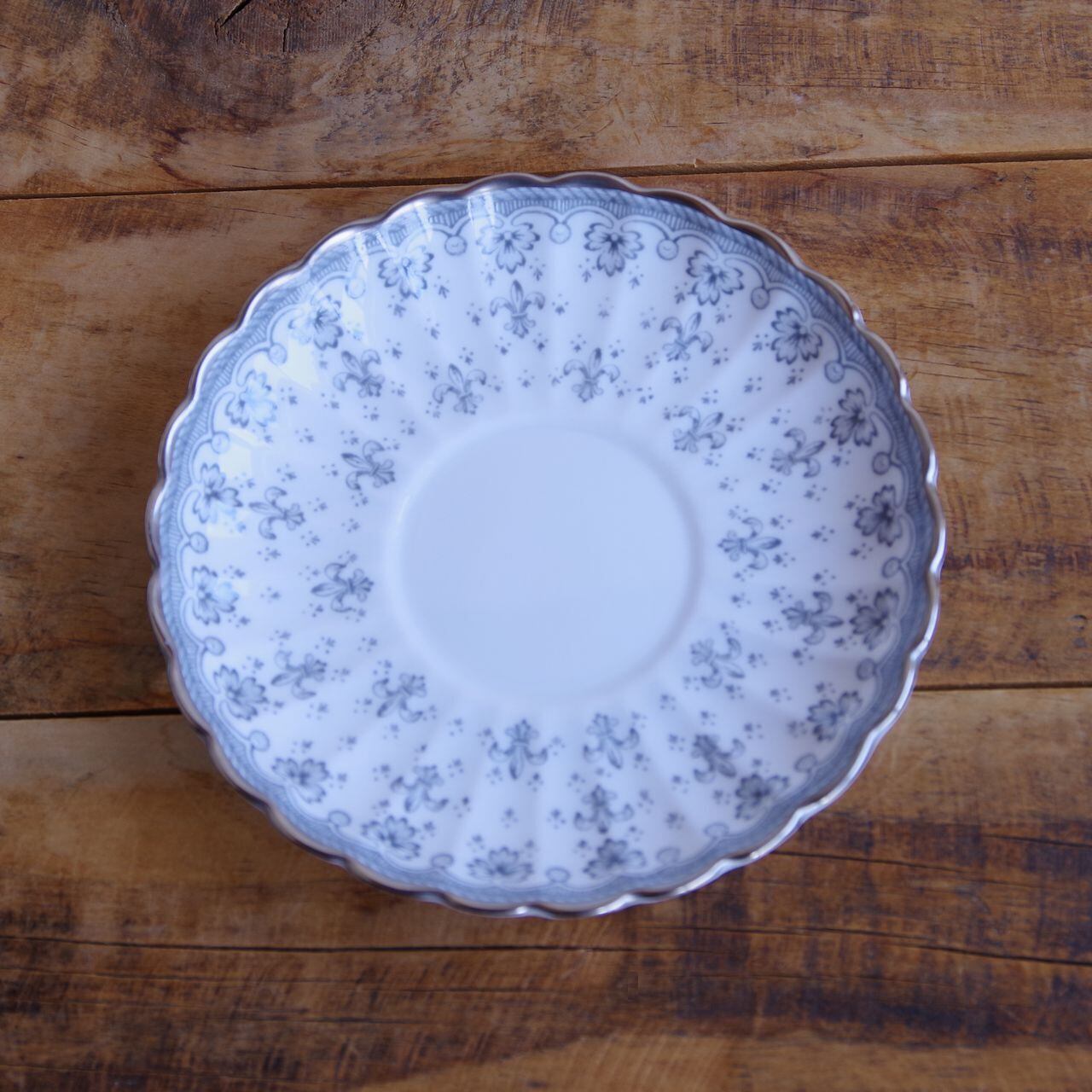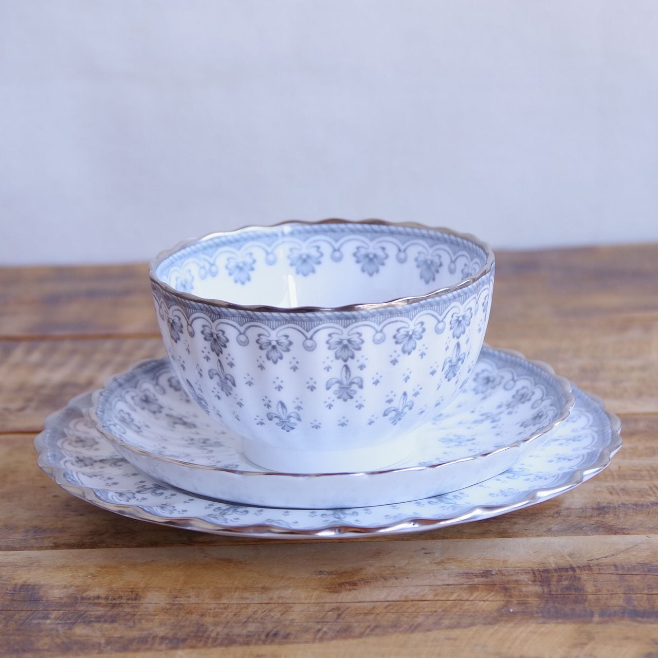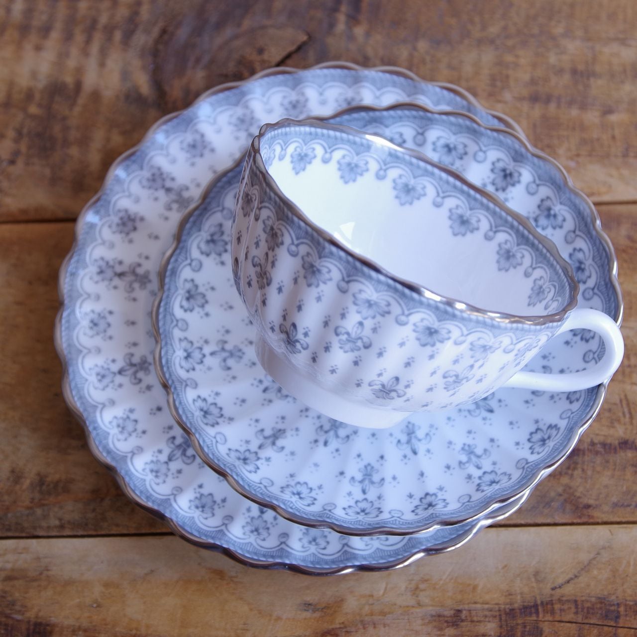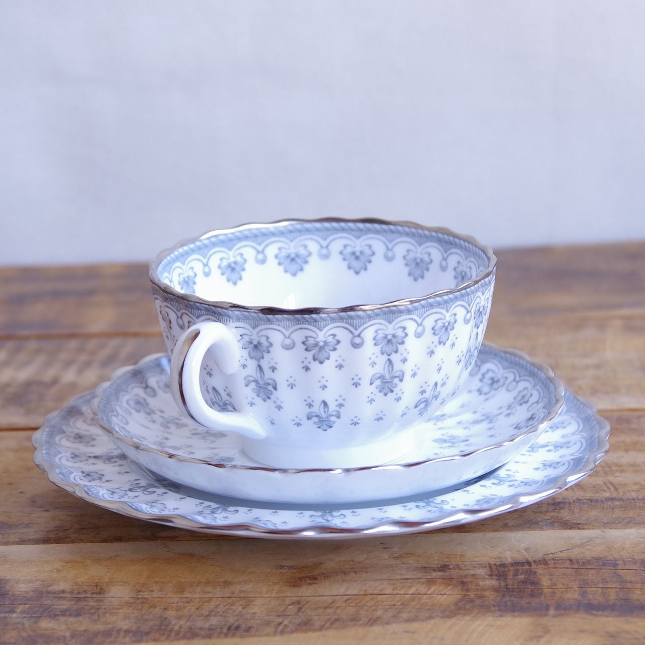 スポード フルール・ド・リス グレー シルバー ティーカップ ソーサー デザートプレート トリオ Spode Fleur de Lys #260311-1~4 イギリス ヴィンテージ アンティーク 食器 陶磁器 百合 カップ&ソーサー コーヒーカップ ケーキ皿 パン皿