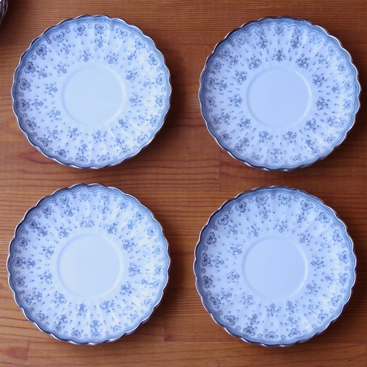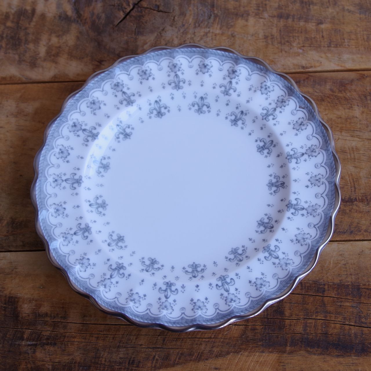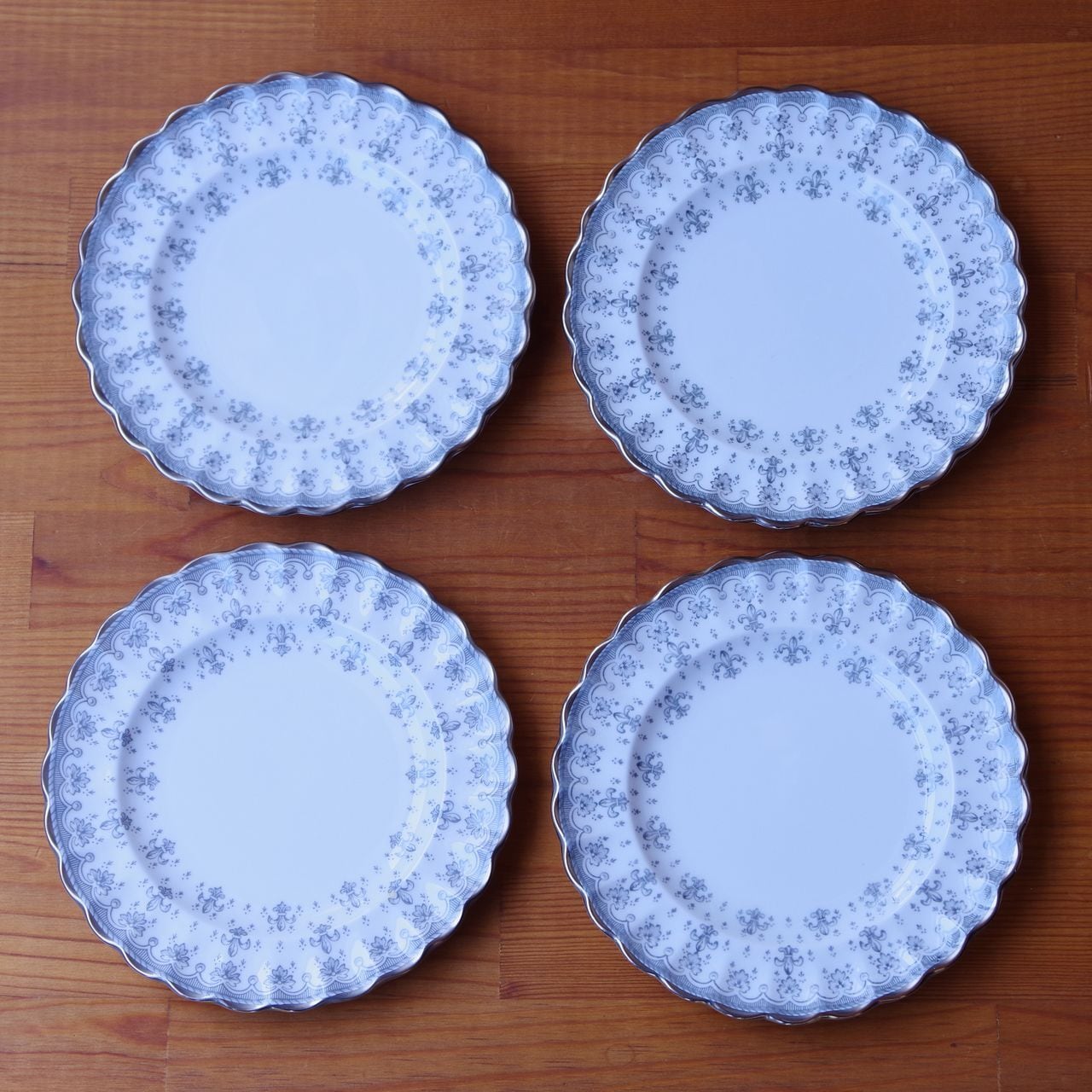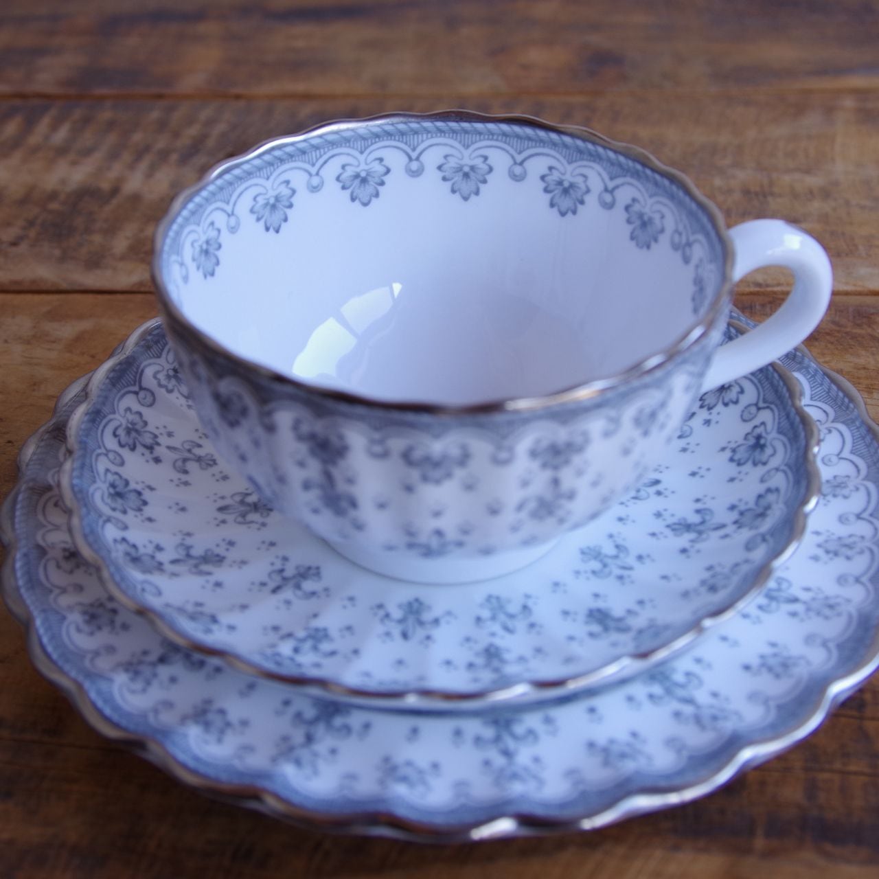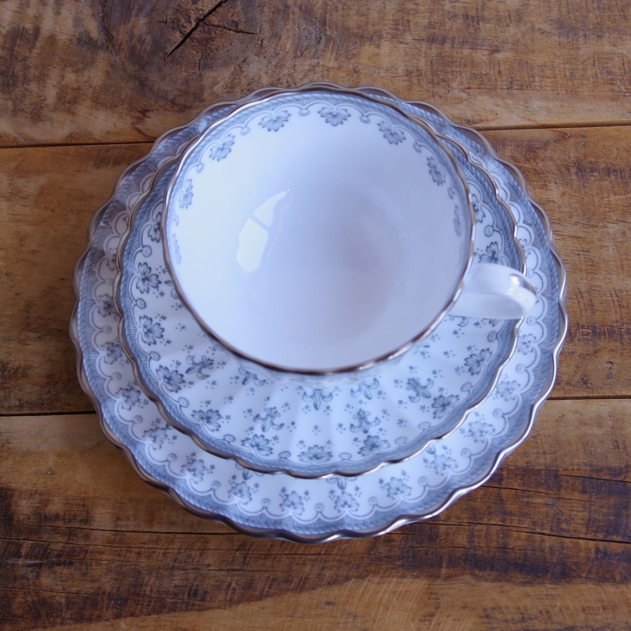 スポード フルール・ド・リス グレー シルバー ティーカップ ソーサー デザートプレート トリオ Spode Fleur de Lys #260311-1~4 イギリス ヴィンテージ アンティーク 食器 陶磁器 百合 カップ&ソーサー コーヒーカップ ケーキ皿 パン皿