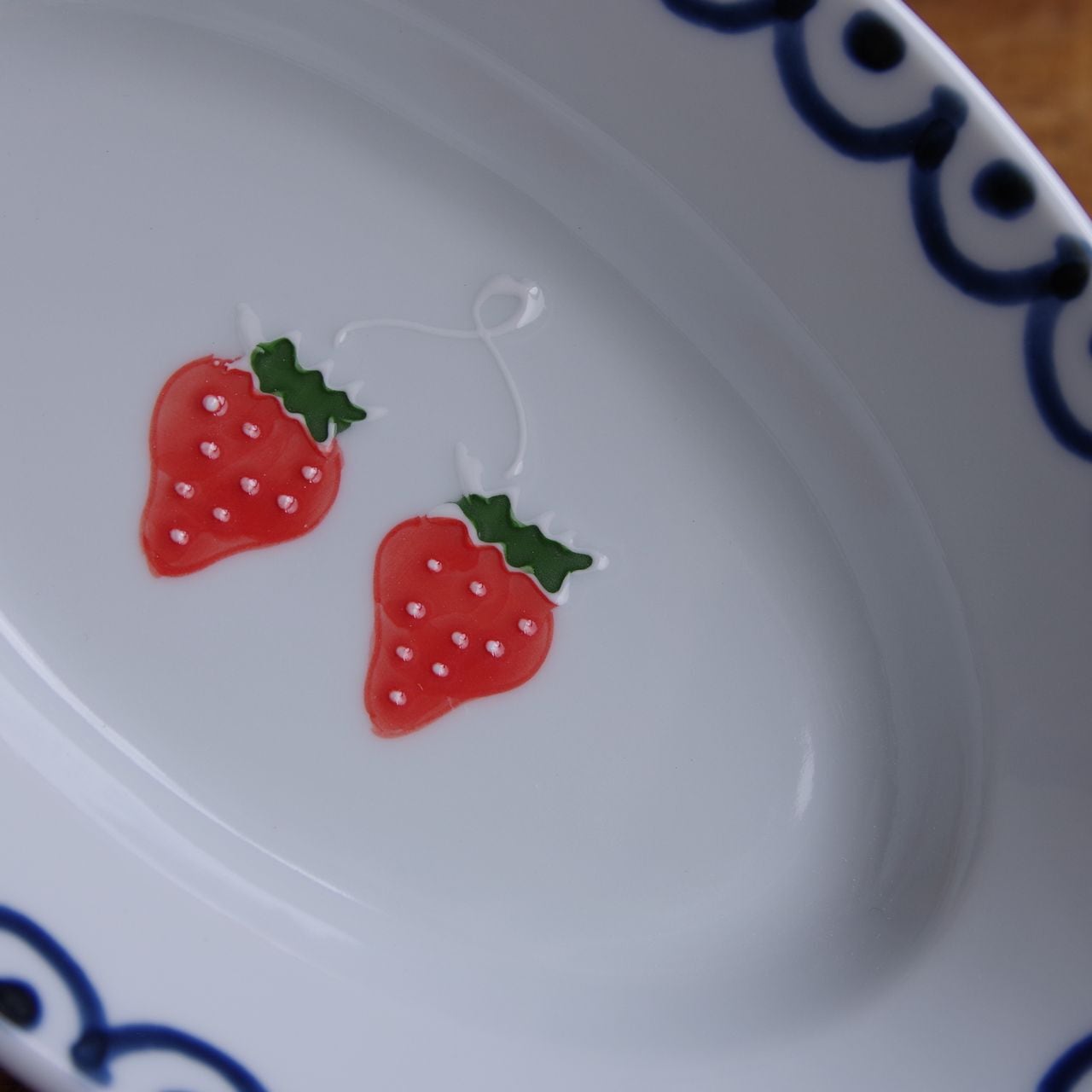 【新品】有田焼 オランダ苺 一珍 いちご フルーツ柄 楕円鉢 21cm 深皿 和食器 日本製 陶磁器 手描き かわいい ポップ 徳七窯 オーバルボウル