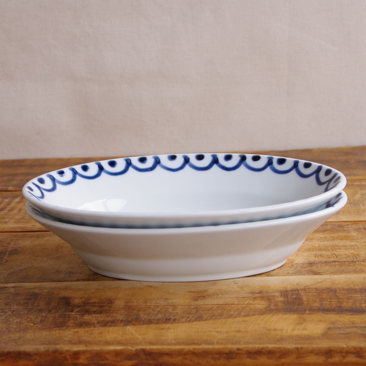 楕円形で舟形のようにリムが反り上がっており、少し深さのある形をしています。