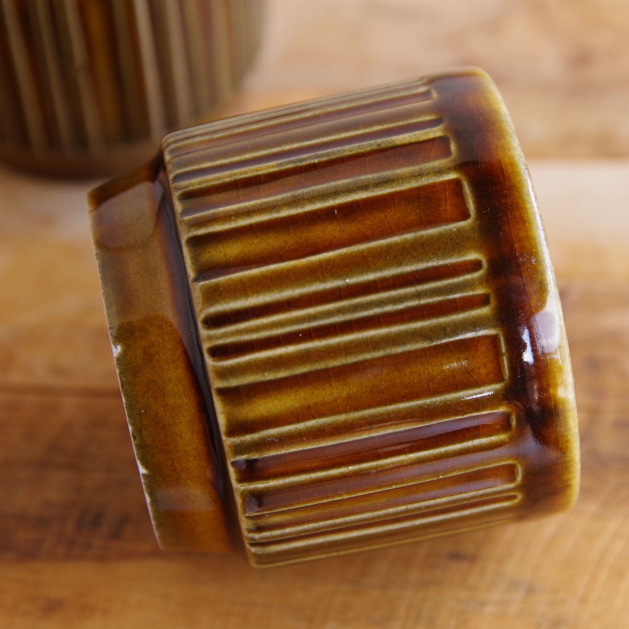 側面に縦に帯状のレリーフが彫られており、全体につやのあるブラウンの釉薬がかけられています。