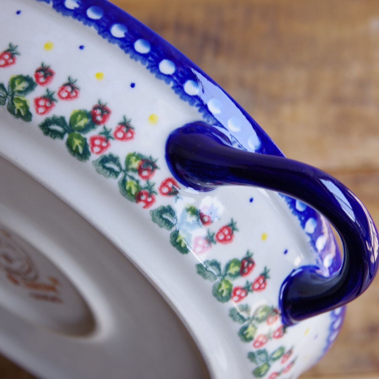 【新品】 ポーランド食器 ポーリッシュポタリー ラウンドキャセロール 持ち手付き オーブンディッシュ グラタン皿 苺 白 花柄 V152-B264 ボレスワヴィエツ陶器 Boleslawiec かわいい 大きめ 22cm 丸い 丸型 深皿 キッシュ型 ボウル イチゴ レトロ