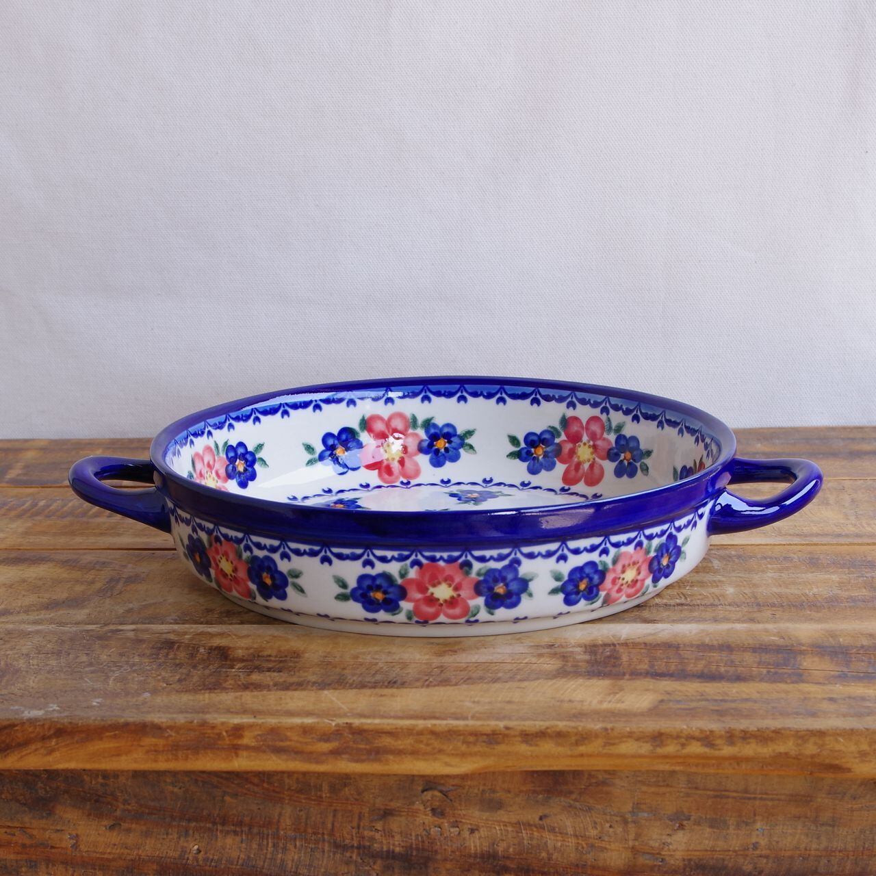 【新品】 ポーランド食器 ポーリッシュポタリー ラウンドキャセロール 持ち手付き オーブンディッシュ グラタン皿 ネイビー 赤 花柄 V152-U072 ボレスワヴィエツ陶器 Boleslawiec かわいい 大きめ 22cm 丸い 丸型 深皿 キッシュ型 ボウル