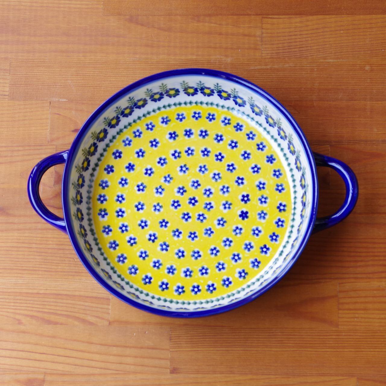 【新品】 ポーランド食器 ポーリッシュポタリー ラウンドキャセロール 持ち手付き オーブンディッシュ グラタン皿 ネイビー 黄色 花柄 木の葉 V152-U198 ボレスワヴィエツ陶器 Boleslawiec かわいい 大きめ 22cm 丸い 丸型 深皿 キッシュ型 ボウル