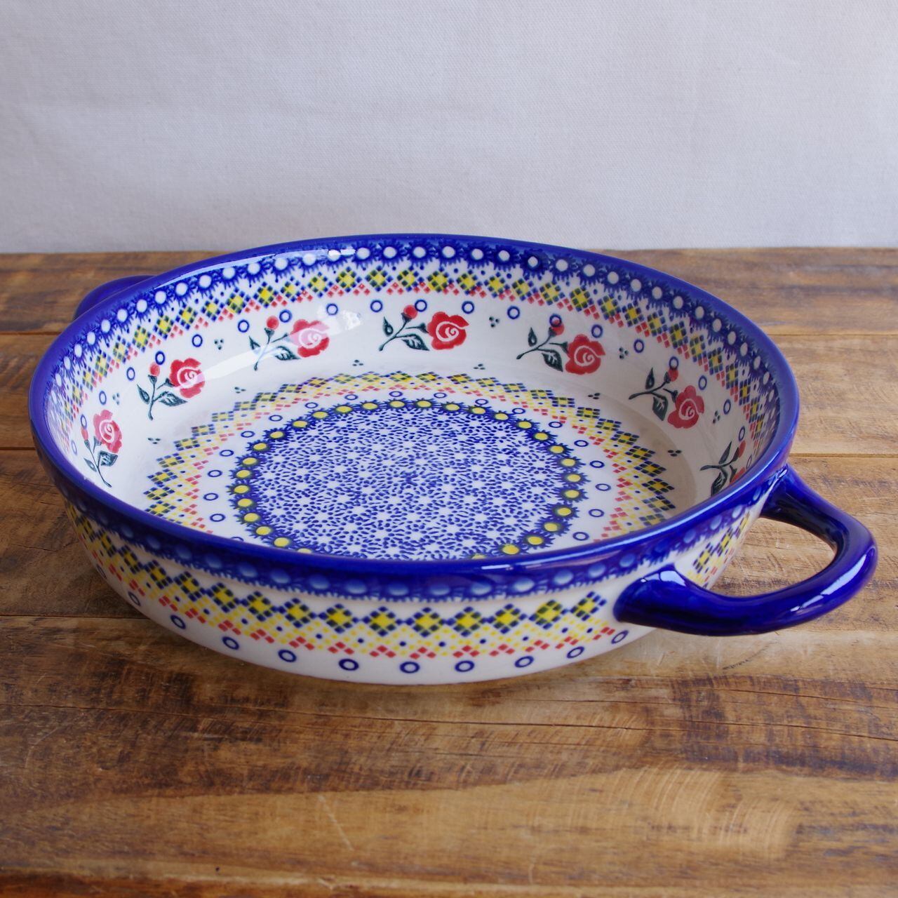 【新品】 ポーランド食器 ポーリッシュポタリー ラウンドキャセロール 持ち手付き オーブンディッシュ グラタン皿 赤 薔薇 花柄 モザイク模様 V152-U504 ボレスワヴィエツ陶器 Boleslawiec かわいい 大きめ 22cm 丸い 丸型 深皿 キッシュ型 ボウル