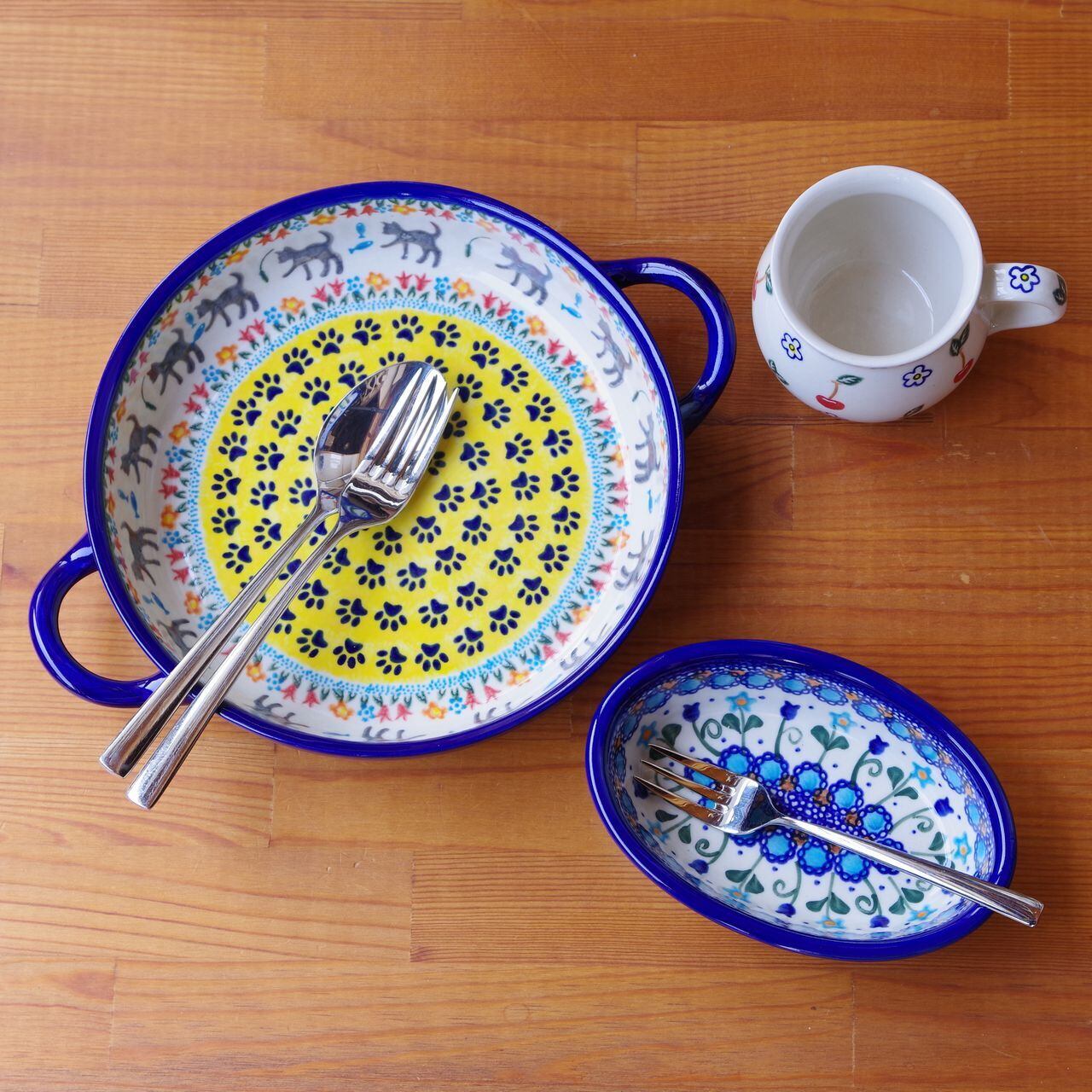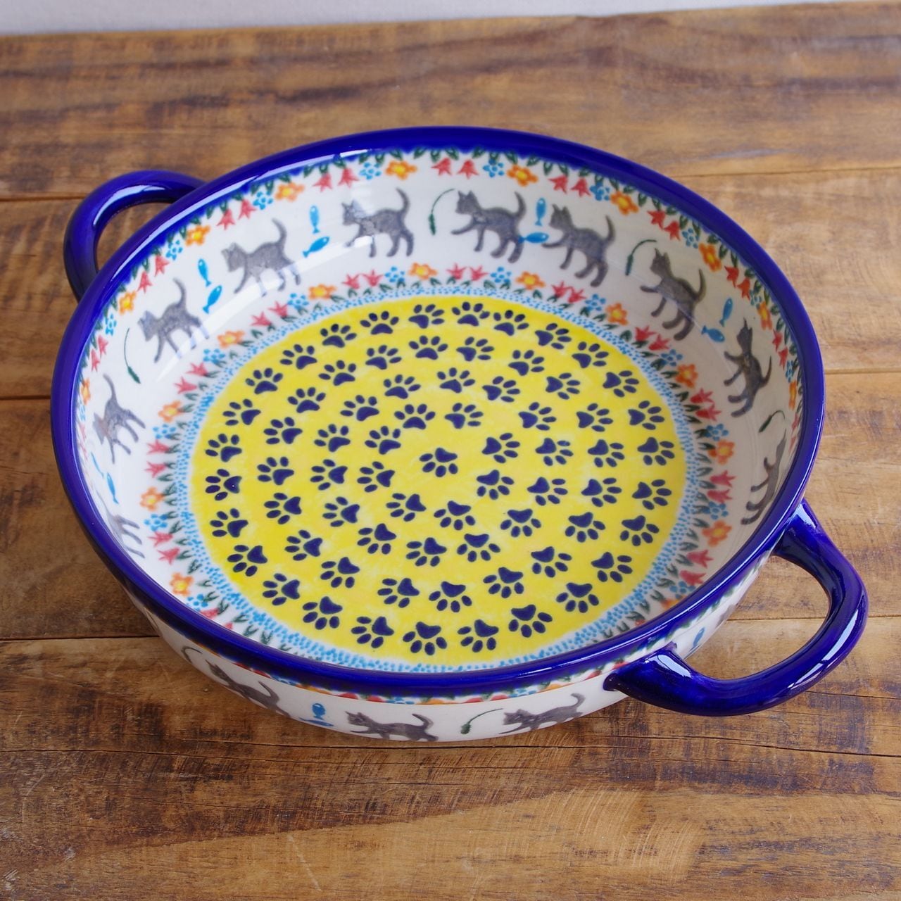 【新品】 ポーランド食器 ポーリッシュポタリー ラウンドキャセロール 持ち手付き オーブンディッシュ グラタン皿 猫 足跡 魚 チューリップ 花畑 V152-U731 ボレスワヴィエツ陶器 Boleslawiec かわいい 大きめ 22cm 丸い 丸型 深皿 キッシュ型 ボウル