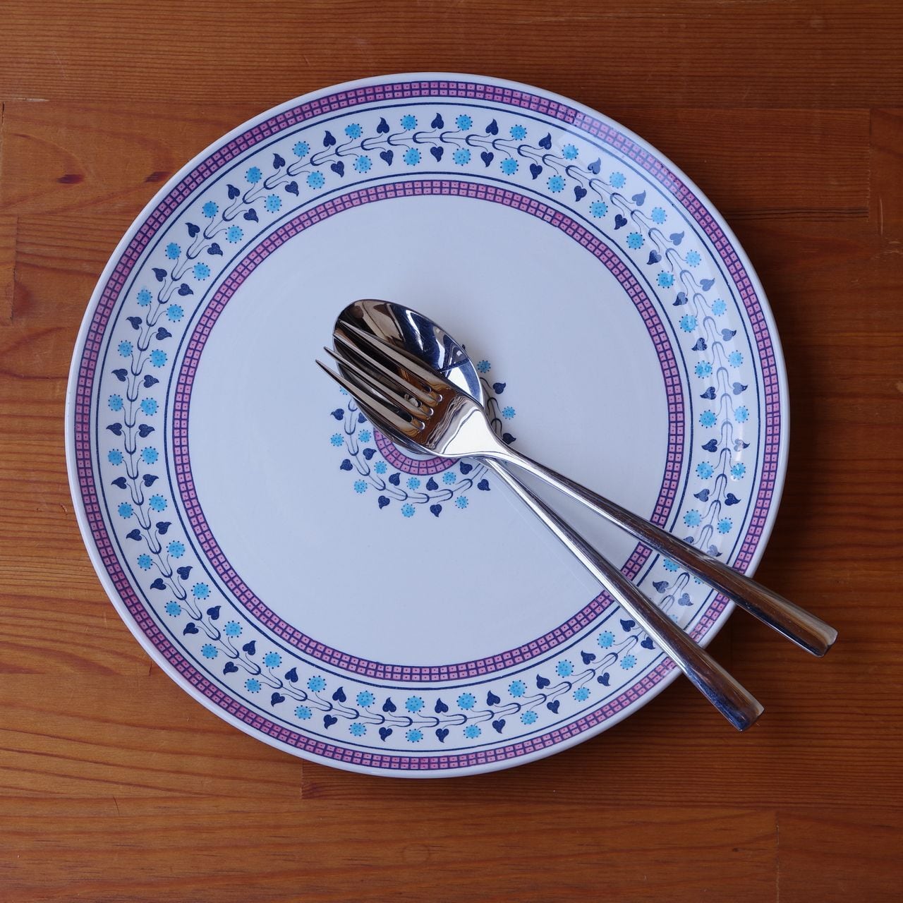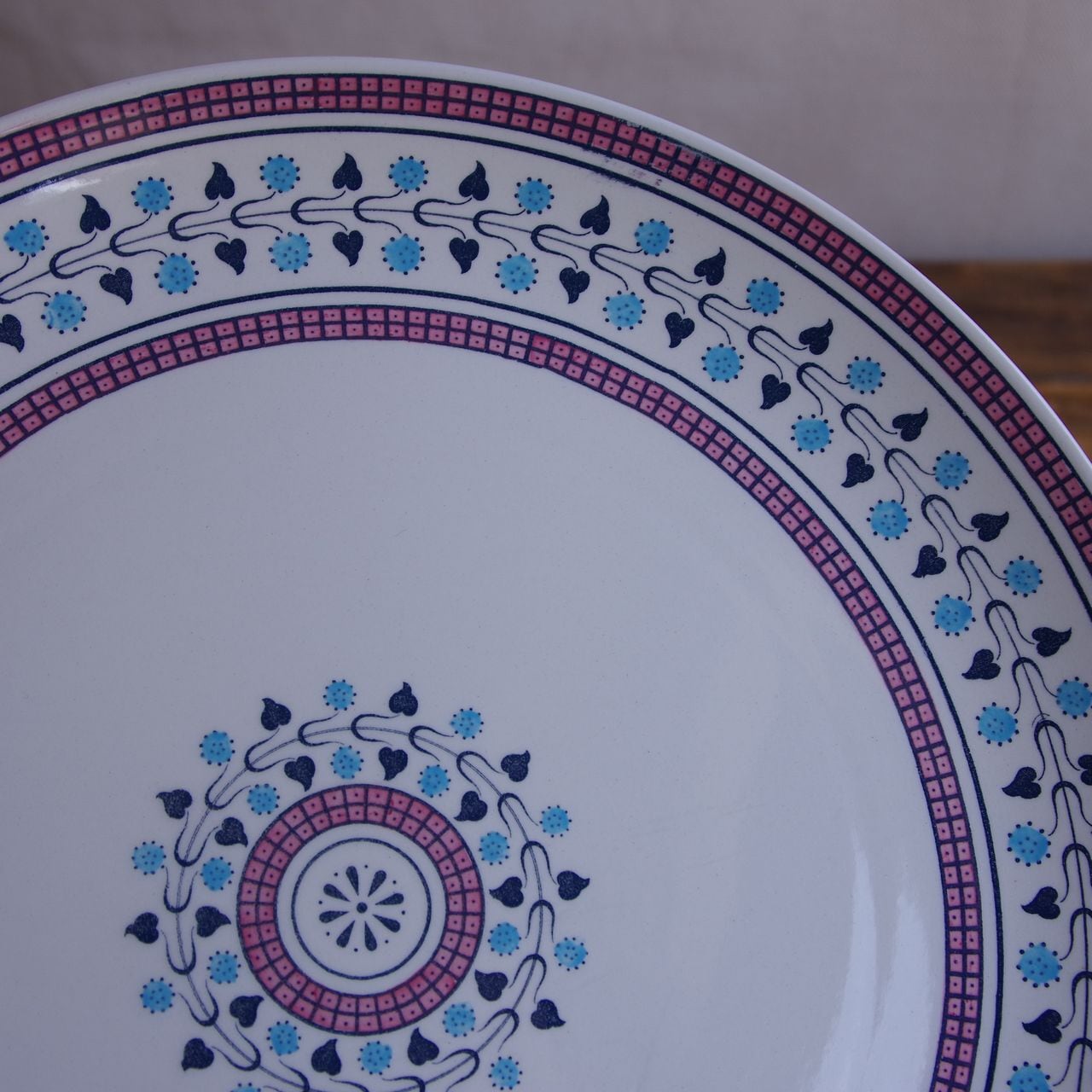 ピンクやブルー、グリーンで、蔦のような植物の絵柄や四角い小さな模様が繰り返し入ったアールデコ風のデザインです。