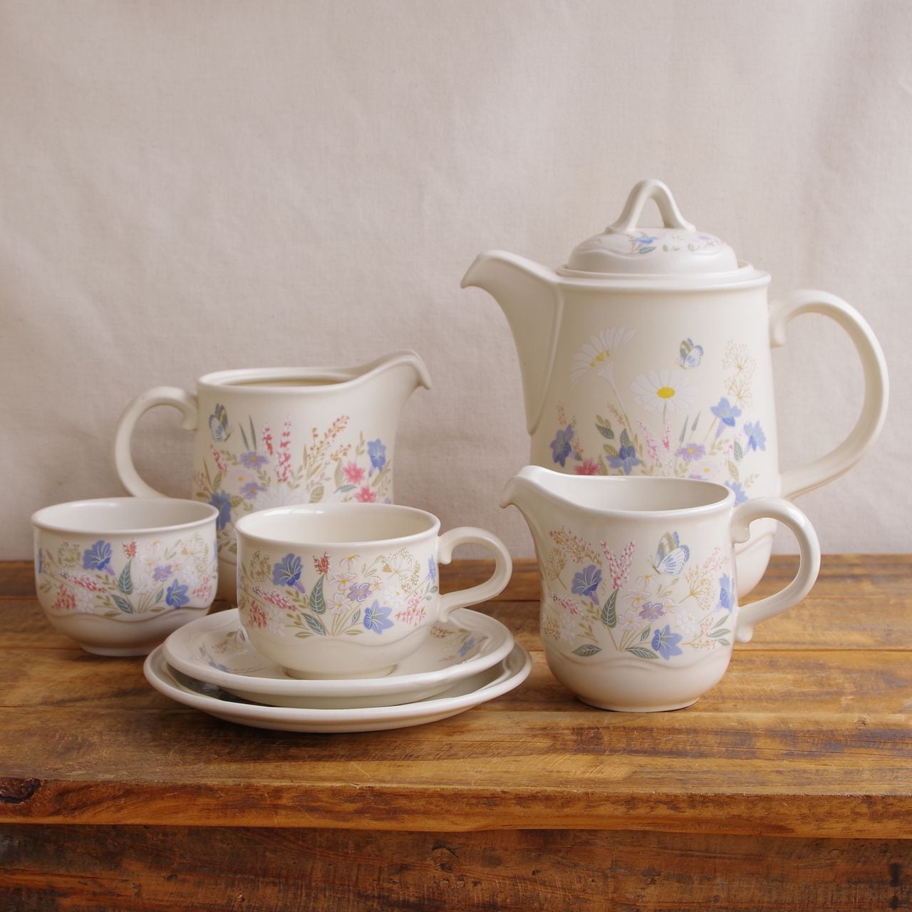 プール スプリングタイム カップ&ソーサー レトロ マット ベージュ 花柄 Poole Springtime #260419-7 イギリス ヴィンテージ 食器 陶器 ミッドセンチュリー 蝶 マーガレット ピンク 水色 コーヒーカップ ティーカップ デュオ