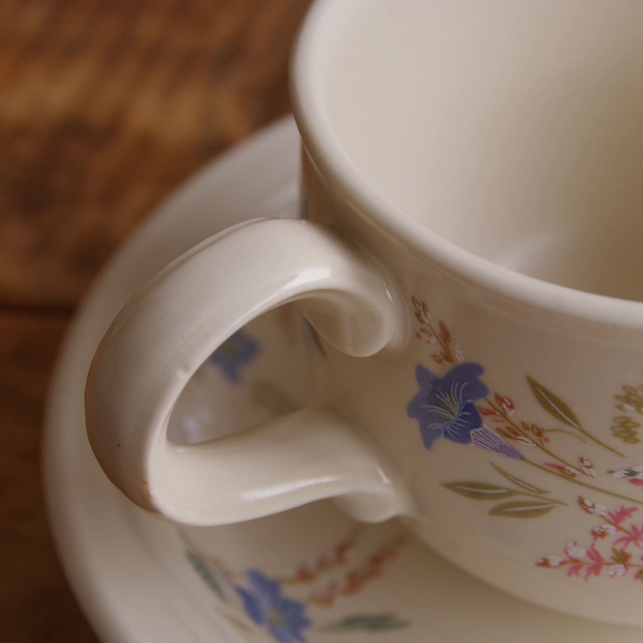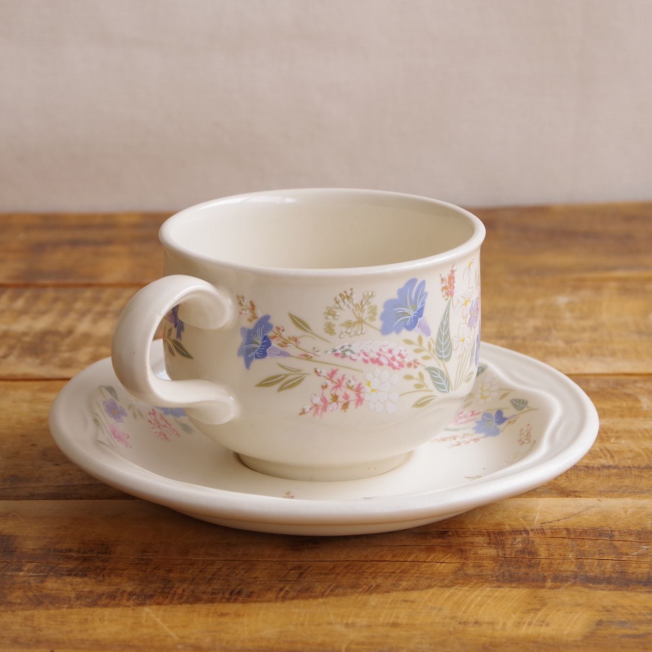 春らしい色とりどりの花や蝶が描かれ、ソーサーのリム部分やカップ側面には波型のレリーフが入っています。