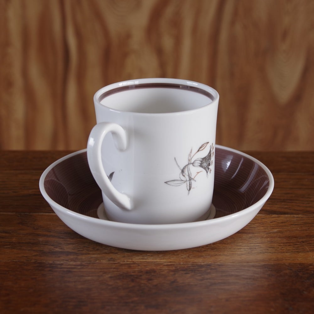 ソーサーには、紫とブラウンの中間のような色が塗られています。