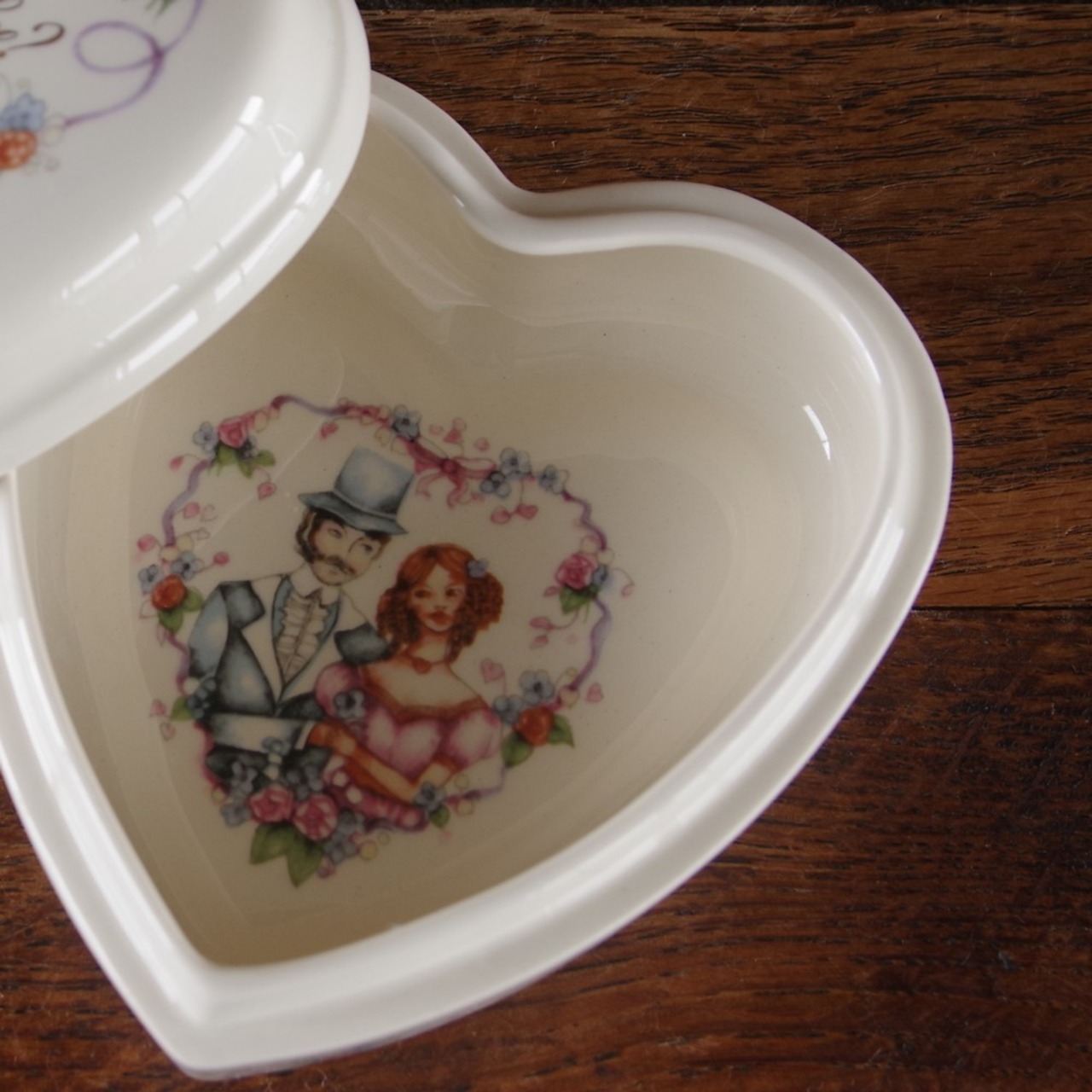 ハート型のかわいい形で、蓋には薔薇の花やリボン、ツバメが描かれています。