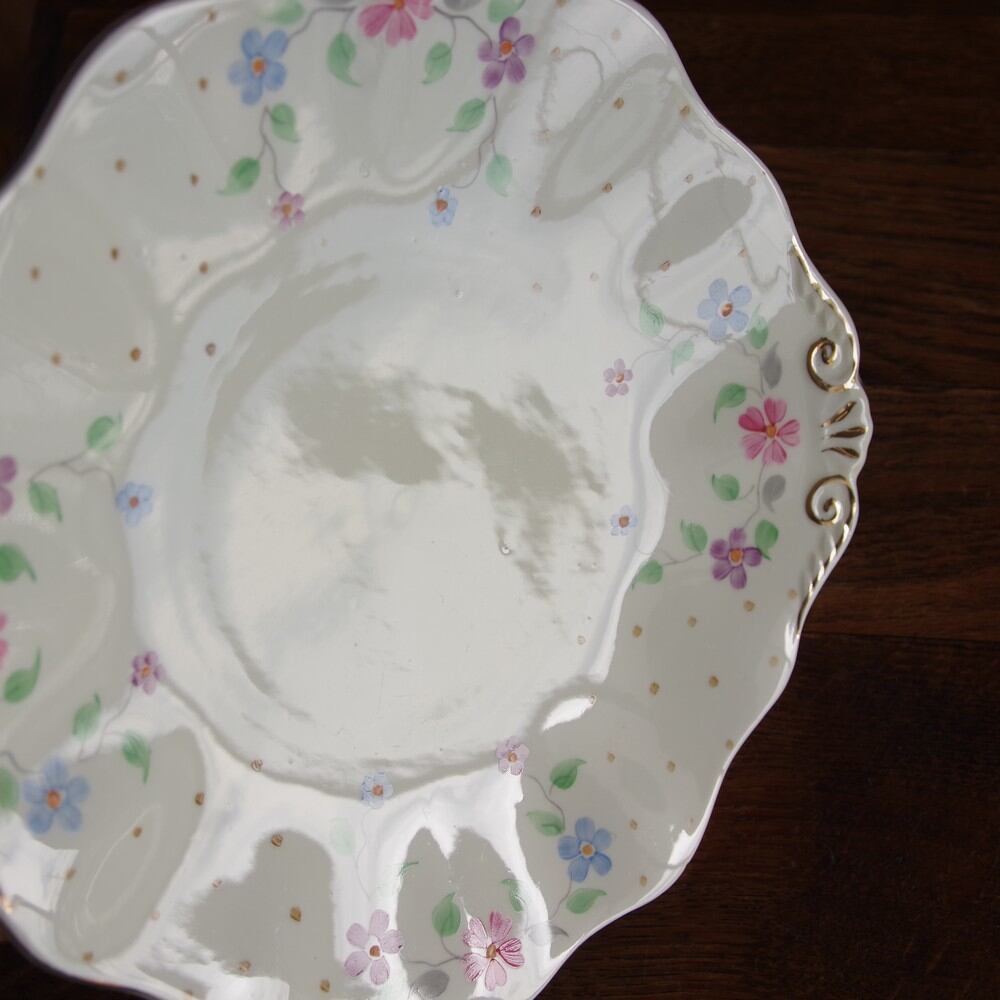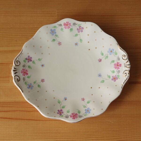 イギリス アンティーク食器 Foley フォーリー 手描き花柄 プレート 23cm 持ち手付き #190125 ヴィンテージ 陶磁器 レトロ 水玉 ピンク むらさき 中皿 盛り皿