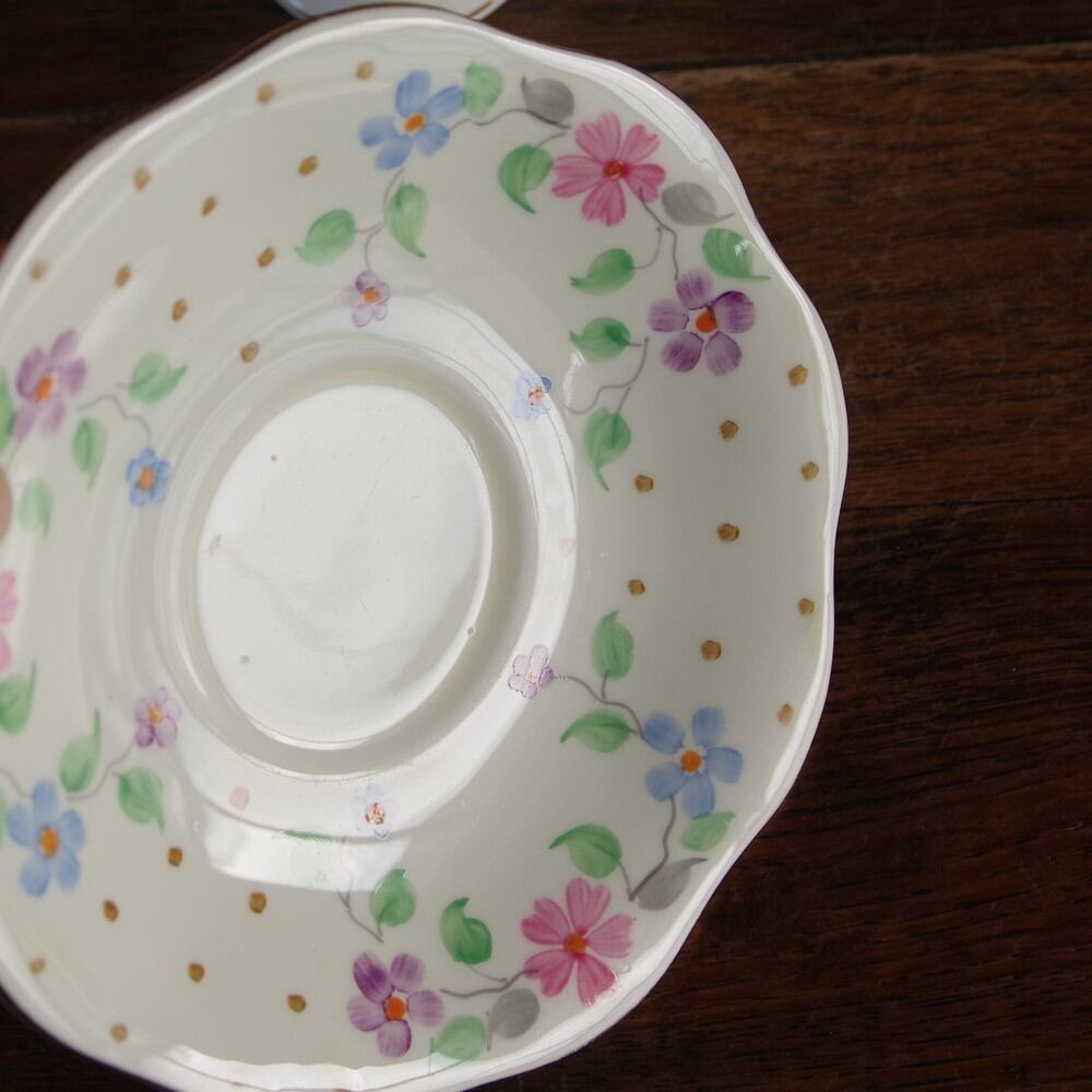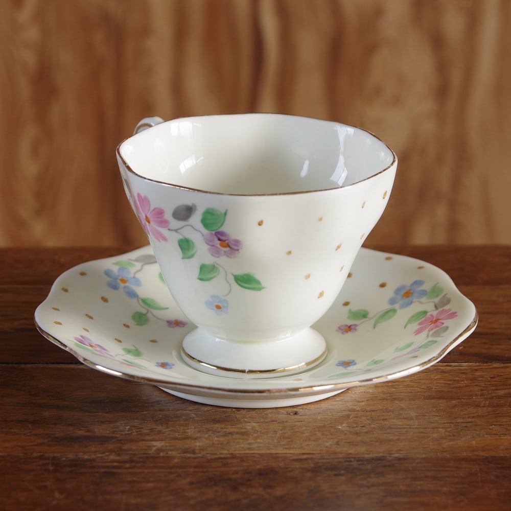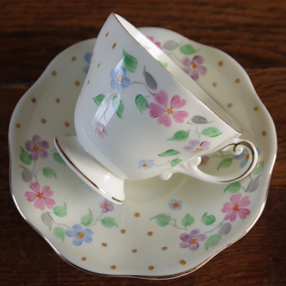イギリス ヴィンテージ食器 Foley フォーリー 手描き花柄 コーヒーカップ ソーサー #190125-1 アンティーク 陶磁器 レトロ 水玉 ピンク むらさき