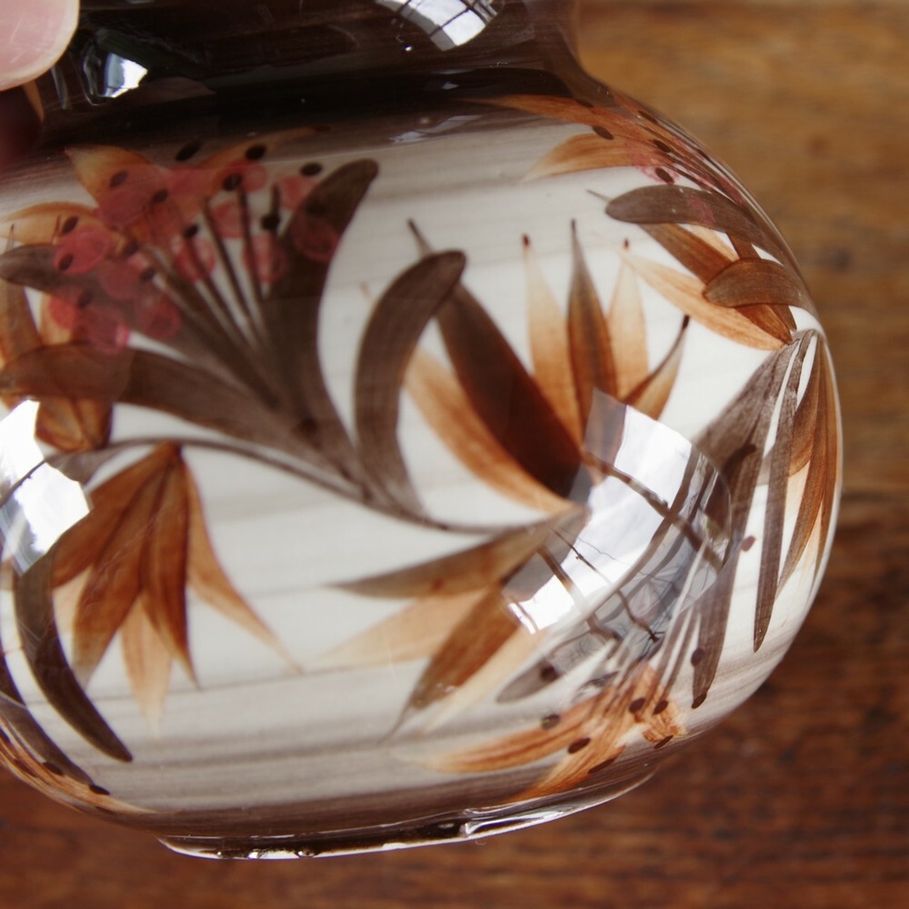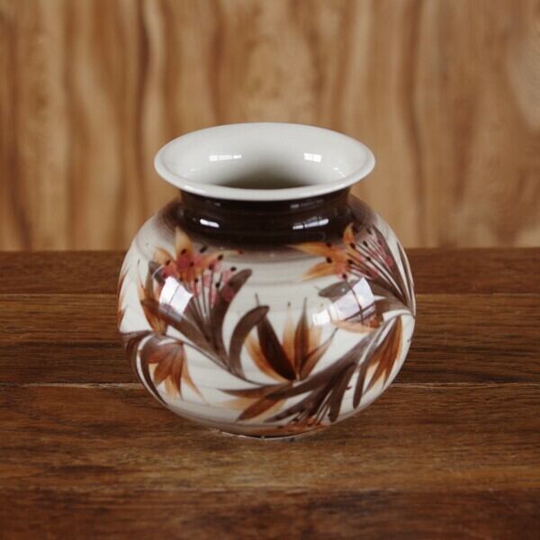 丸い壺のような形で、ブラウンで百合の花のような絵柄が入っています。