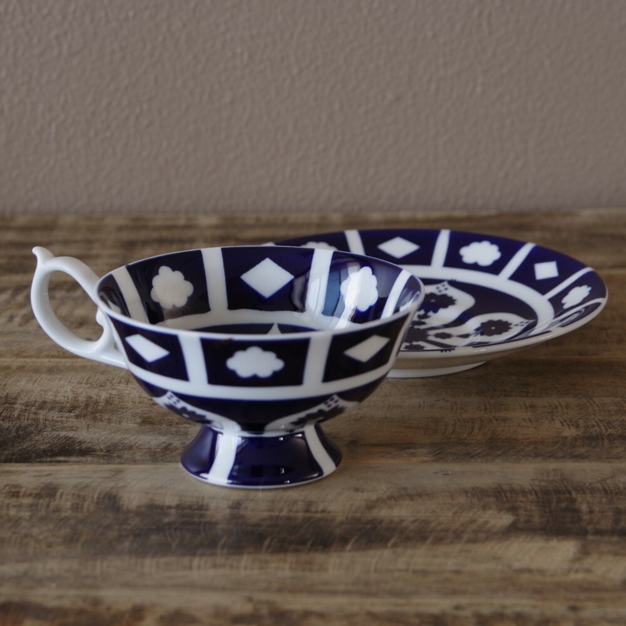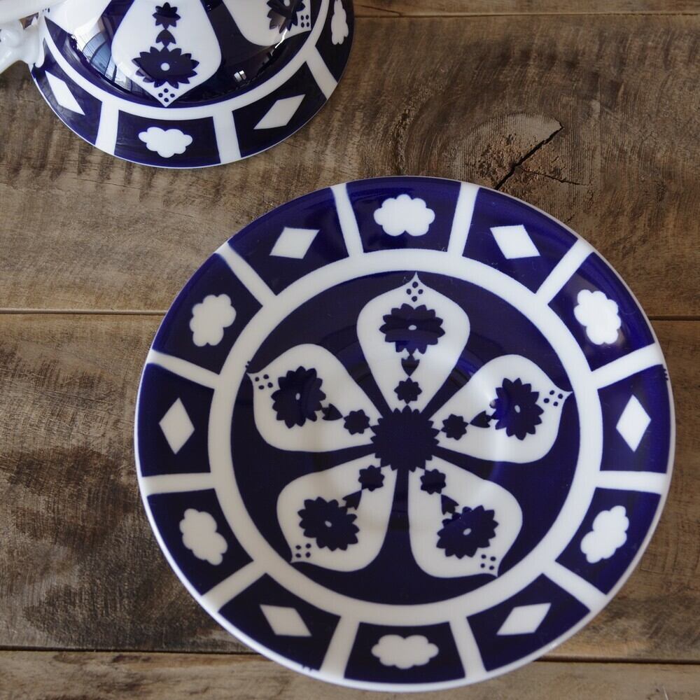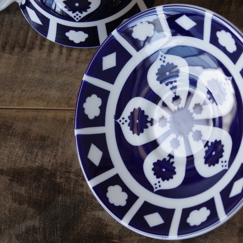 コバルトブルーで家紋を思わせる模様が白抜きされています。