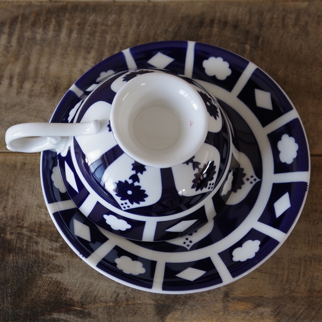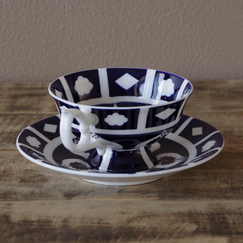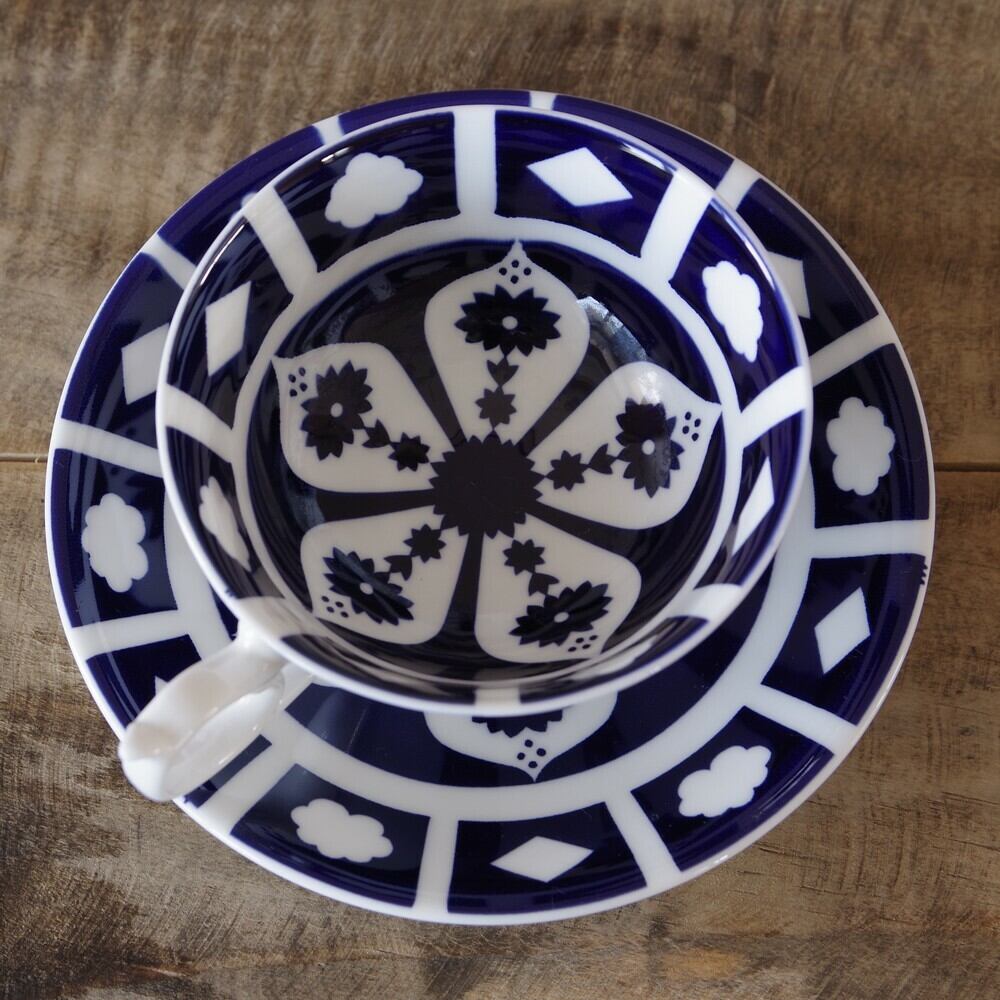 コバルトブルーで家紋を思わせる模様が白抜きされています。