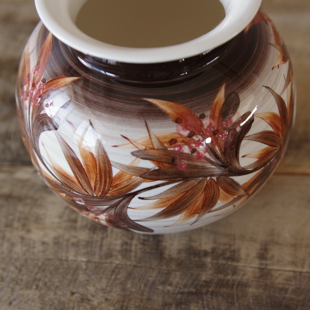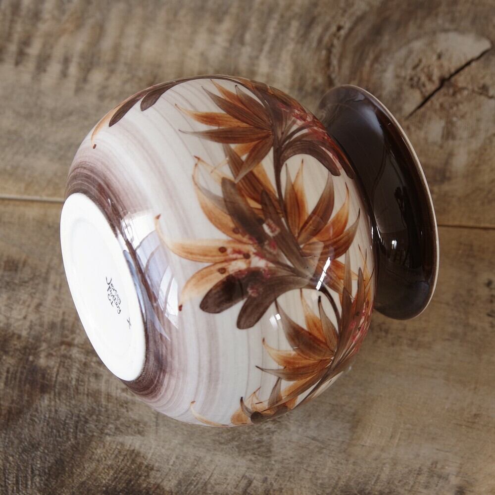 丸い壺のような形で、ブラウンで百合の花のような絵柄が入っています。
