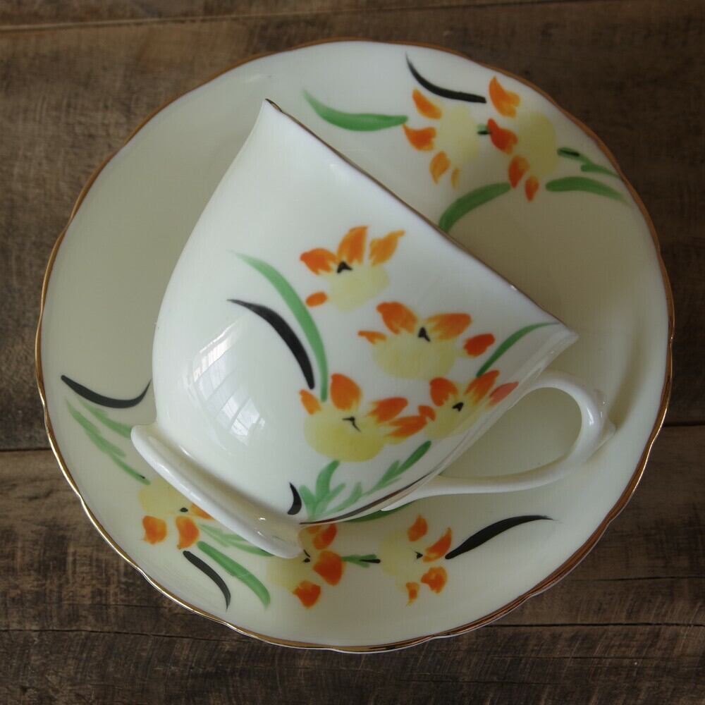 アンティーク 陶磁器 New Chelsea オレンジ花柄 コーヒーカップ ソーサー デザートプレート トリオ #190701 イギリス製 レトロ ニューイングランド ケーキ皿