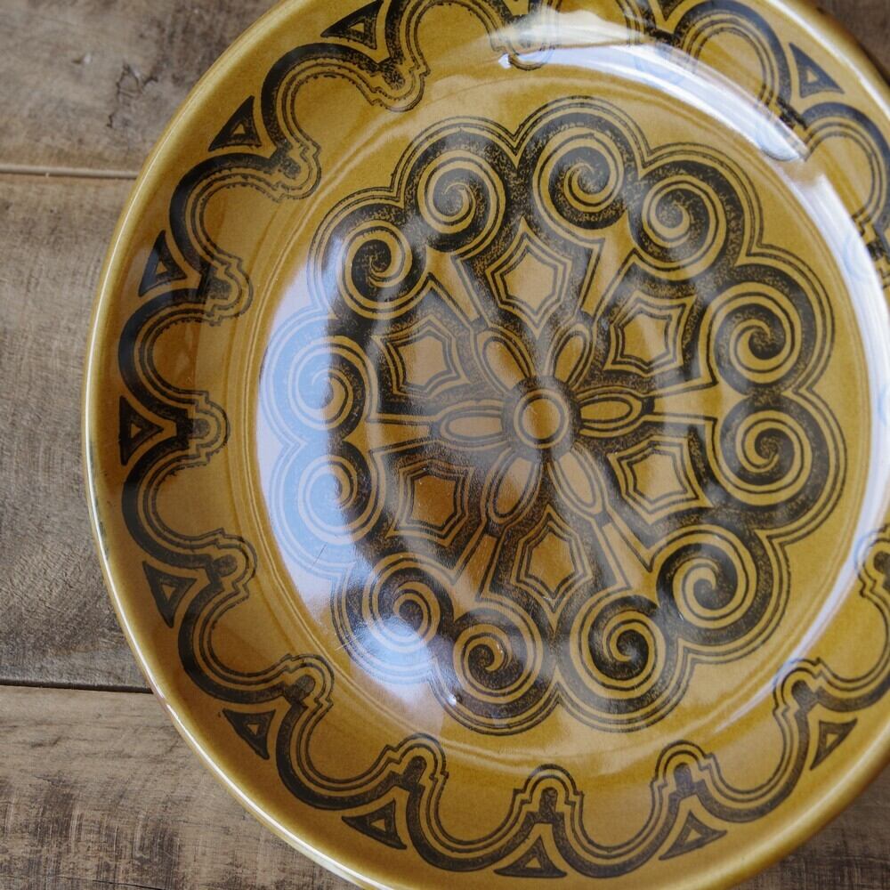 アラベスク柄のような黒い模様が入ったブラウンのプレートです。