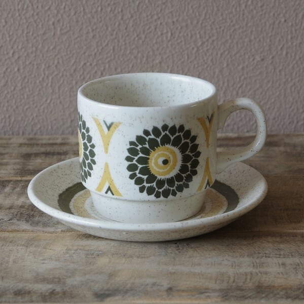 カップ側面にはグリーンやベージュで、レトロな花の絵柄が入っています。