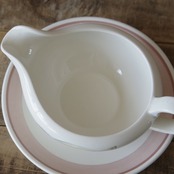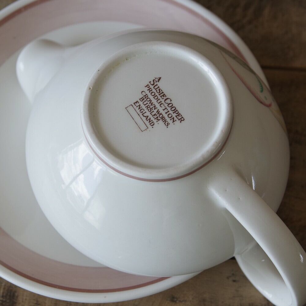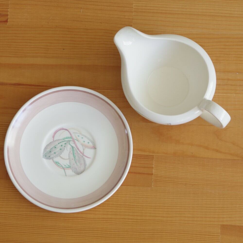 ヴィンテージ食器 スージークーパー ピンク 羽根模様 ソースピッチャー #190814 レトロ ソーサー付き 陶器 Susie Cooper