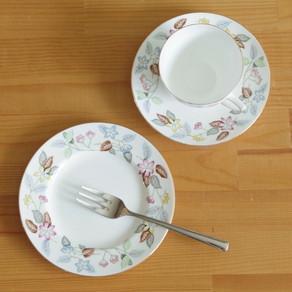 イギリスの陶器メーカー Minton のカップ、ソーサー、プレートのセット(トリオ)です。