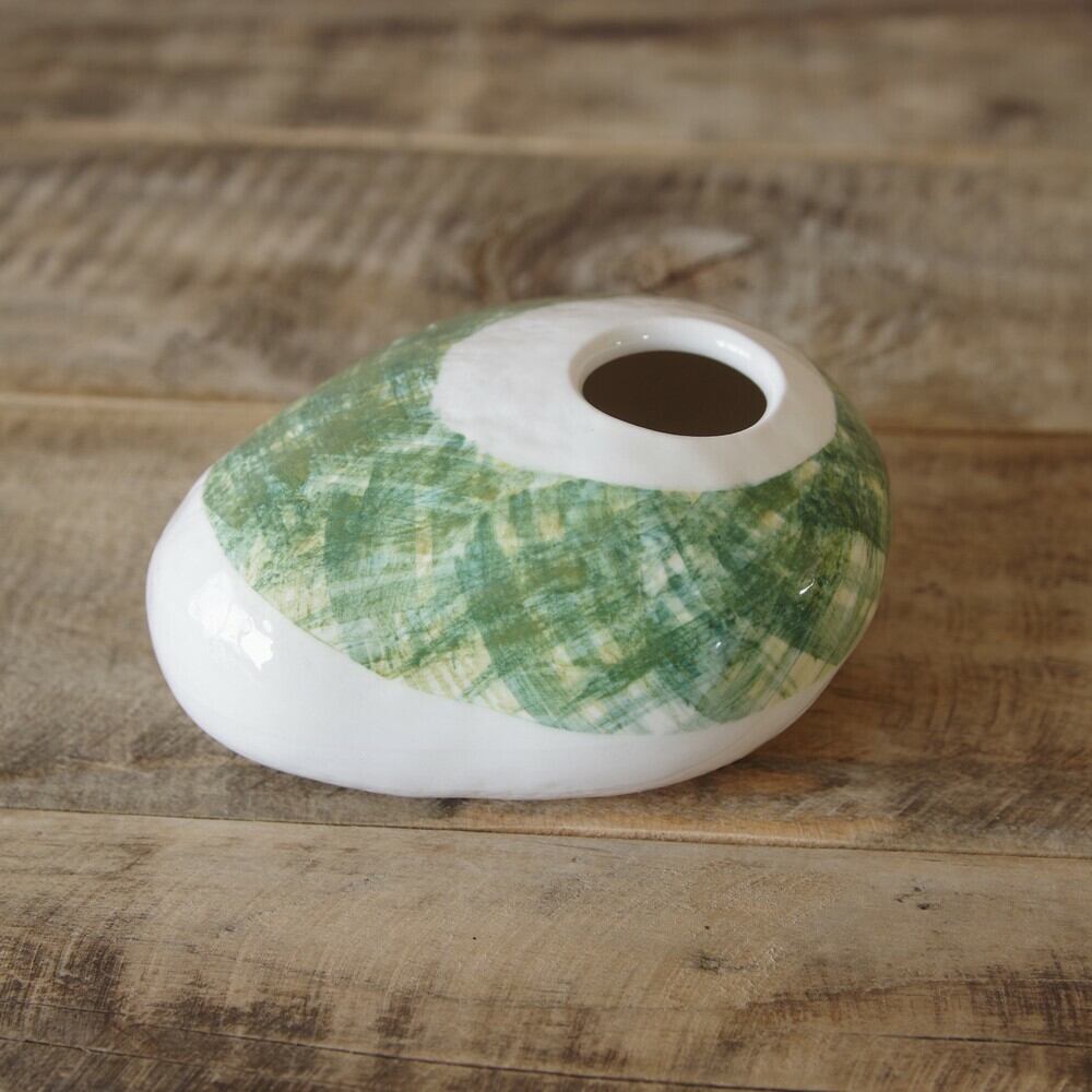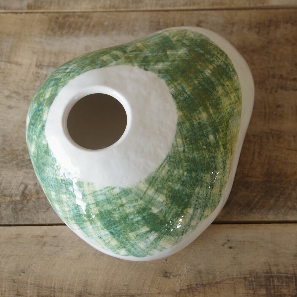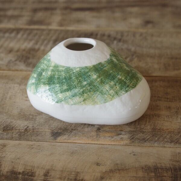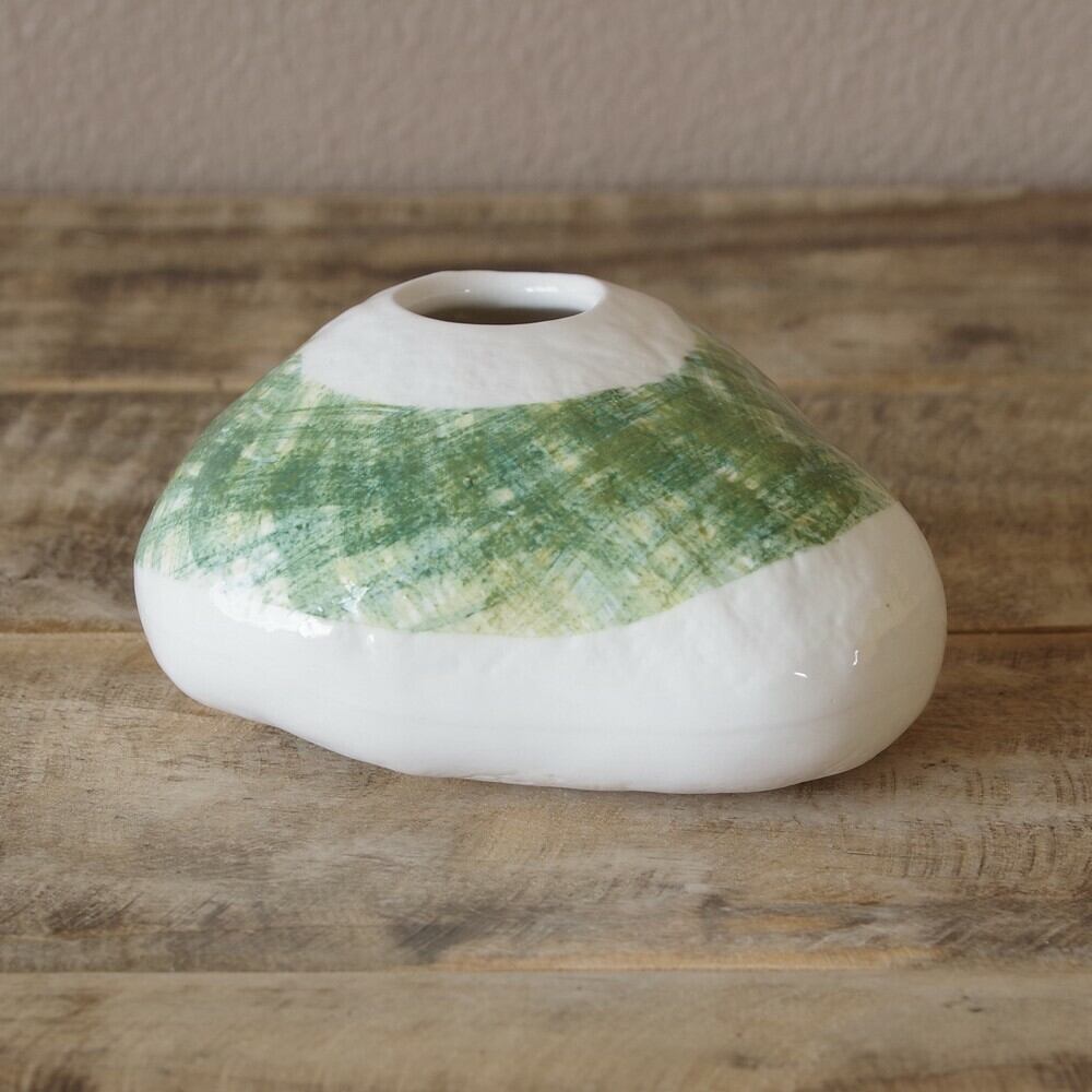 丸く小さな花瓶で、いびつで有機的な形をしています。