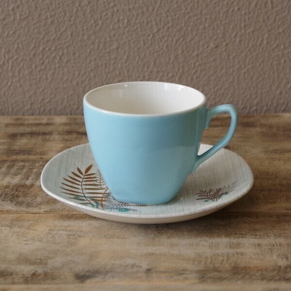 J&G Meakin ミーキン 水色 羊歯 リーフ柄 カップ&ソーサー ミッドセンチュリー #191017-1~5 レトロモダン 小さめ チェック 格子柄 ヴィンテージ 陶器