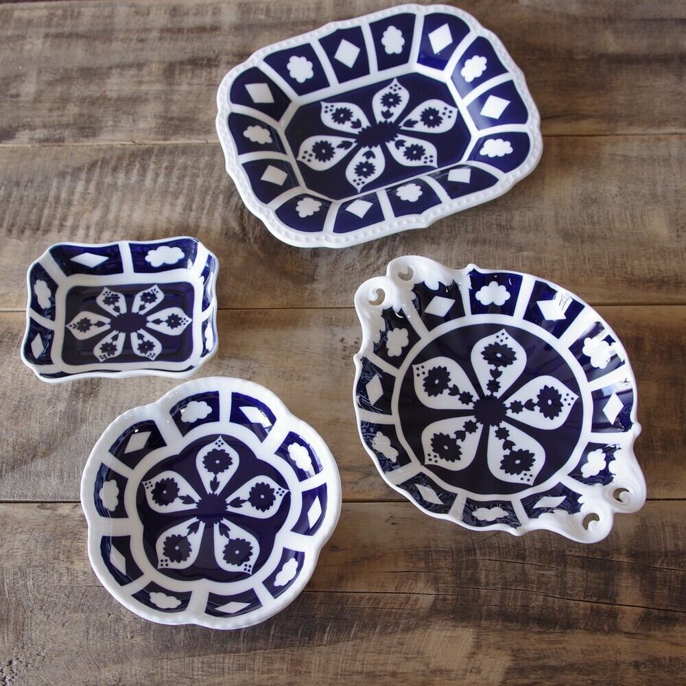 コバルトブルーで家紋を思わせる模様が白抜きされています。