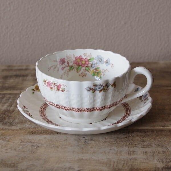 カップの側面やソーサーのリム部分には、籐を編み込んだようなレリーフが入っています。