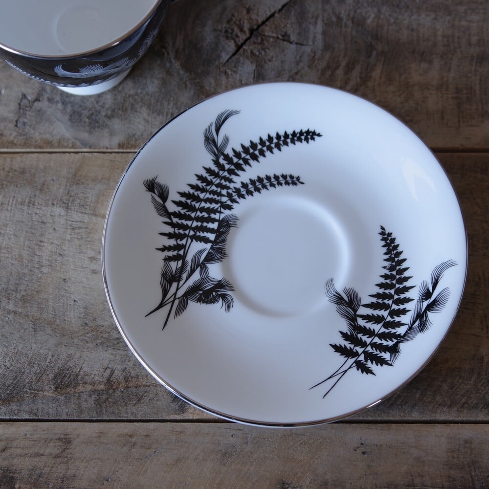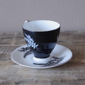 カップの側面は黒地に羊歯のような葉の絵柄が白抜きされています。