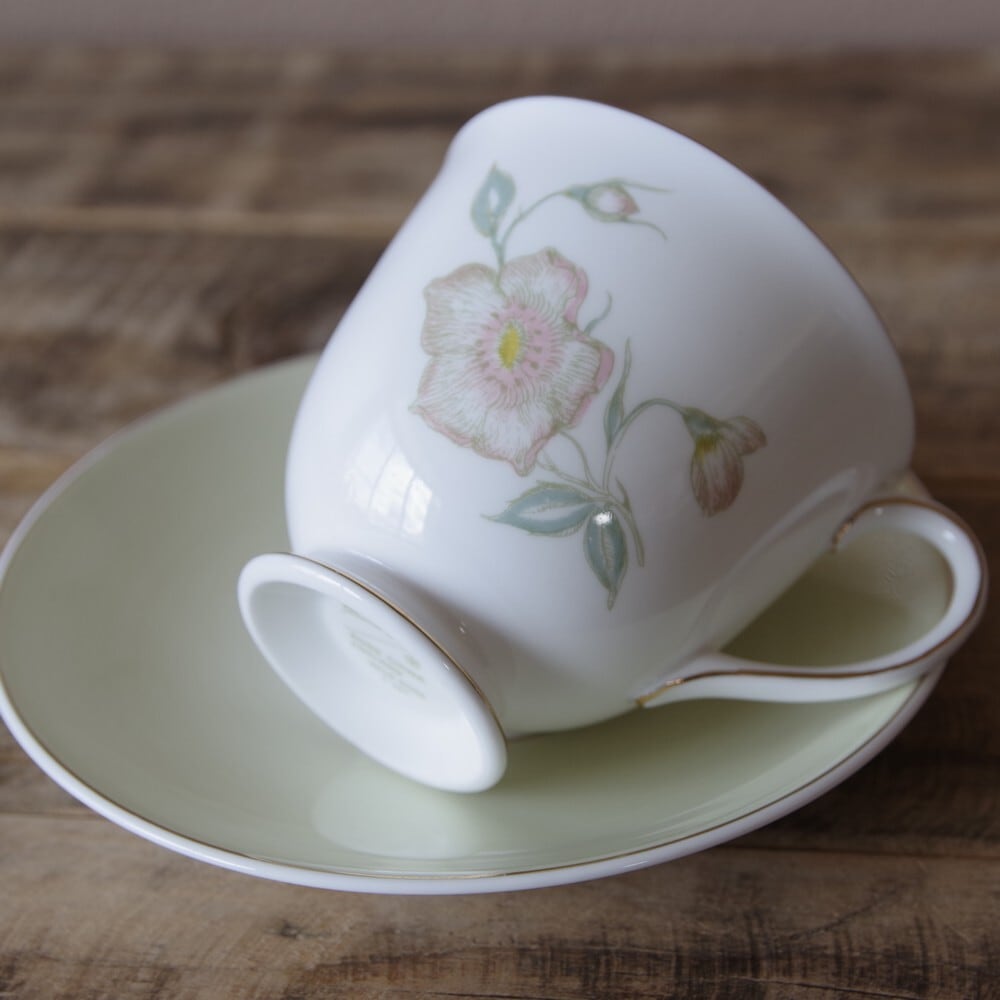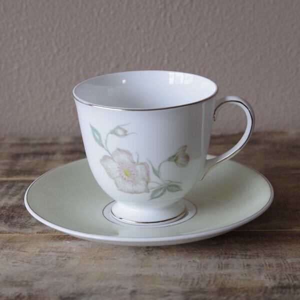 ソーサーのリム部分は淡いグリーン色に塗られており、