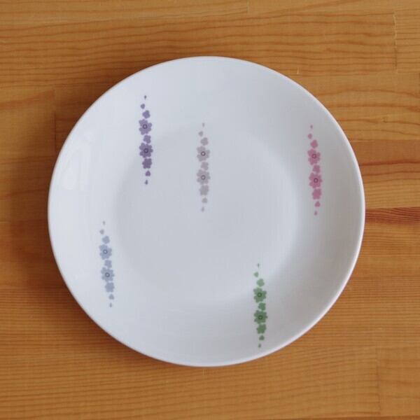 レトロなパステルカラーの花柄がプリントされたかわいらしいお皿です。
