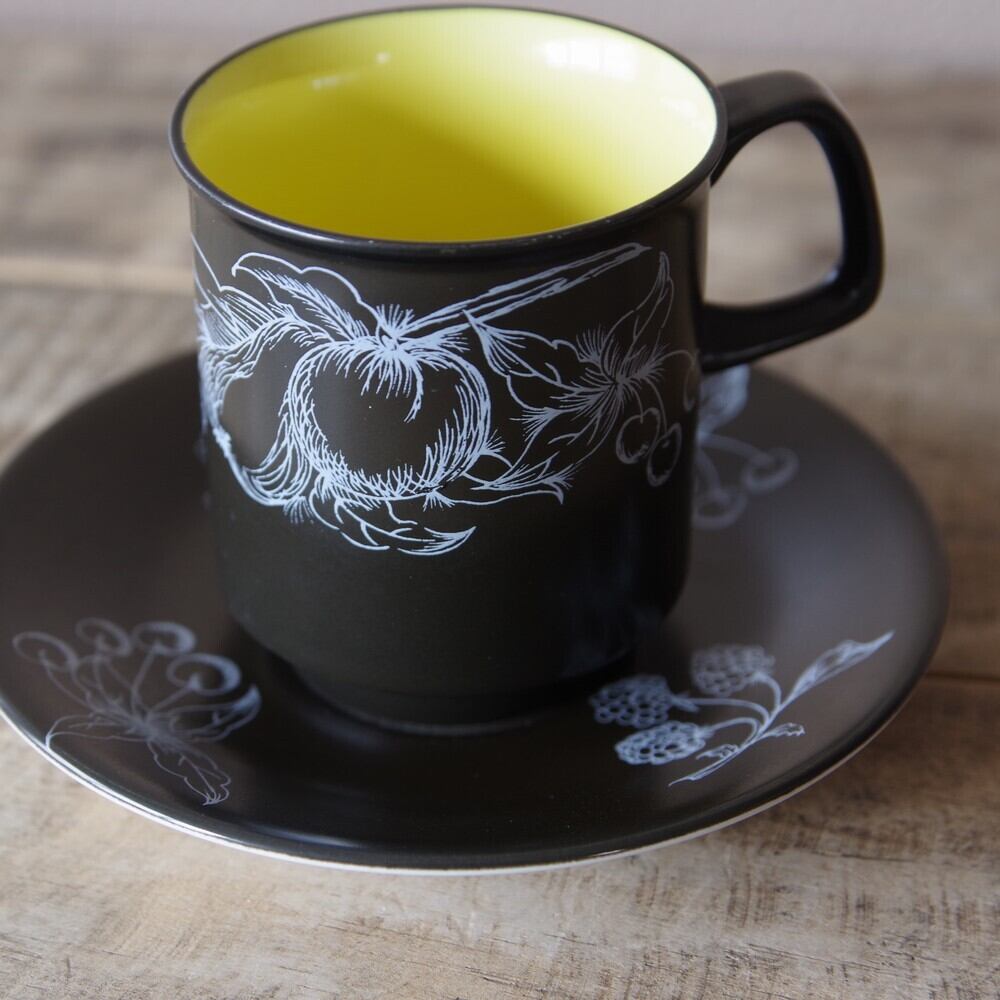 イギリス Crown Devon クラウンデヴォン ハーレクイン コーヒーカップ ソーサー フルーツ柄 黒 イエロー #200204-1 レトロ ヴィンテージ 食器 陶磁器 Harlequin ブラック