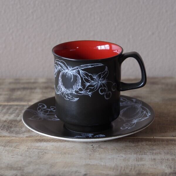 イギリス Crown Devon クラウンデヴォン ハーレクイン コーヒーカップ ソーサー フルーツ柄 黒 赤 #200204-2 レトロ ヴィンテージ 食器 陶磁器 Harlequin れんが色