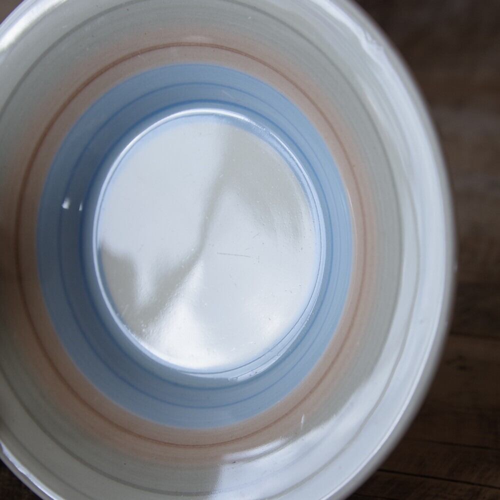 小さめの寸胴のカップで、水色やベージュ、ピンクなど、