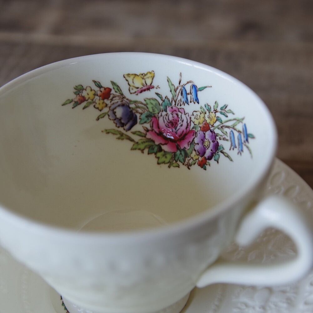 Wedgwood ウェッジウッド ウェルズリー 花柄 蝶 薔薇 ティーカップ ソーサー レリーフ #200227-2 アンティーク 食器 Tintern ヴィンテージ イギリス 陶器