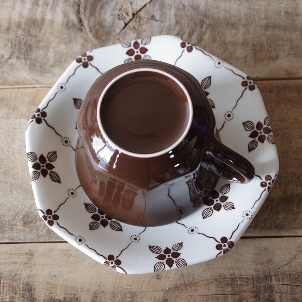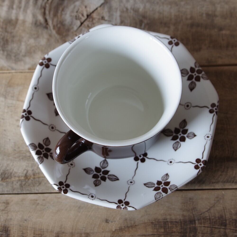 ソーサーには白地にブラウンで、格子状になった花の絵柄が描かれています。