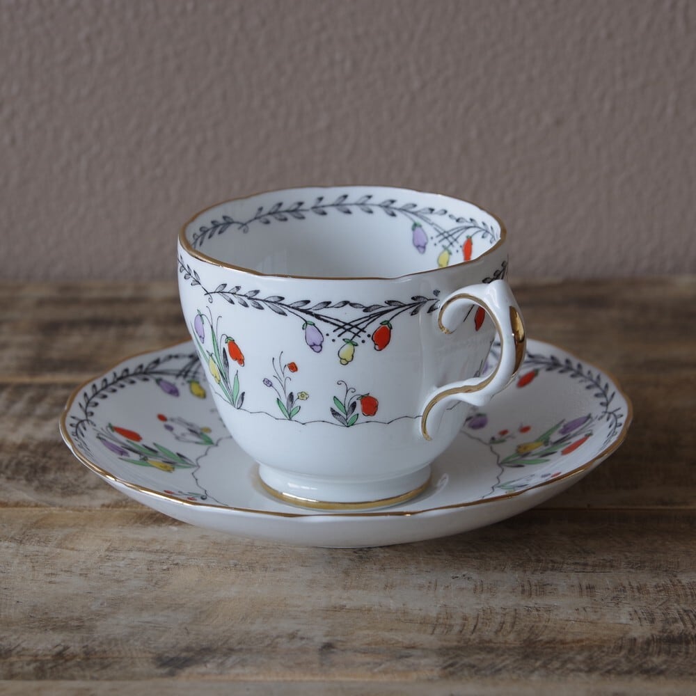 イギリス ヴィンテージ 食器 カラフル 花柄 コーヒーカップ ソーサー #200401-1,2 アンティーク レトロ 陶器 Gresvenor グローブナー アールデコ