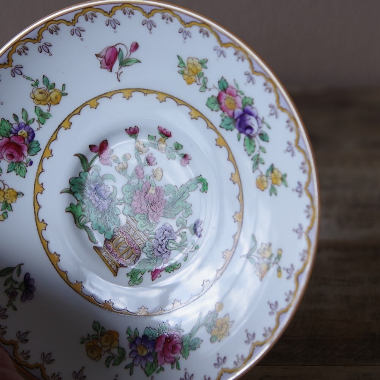 ソーサーには、オリエンタルな雰囲気の花の絵柄が描かれています。