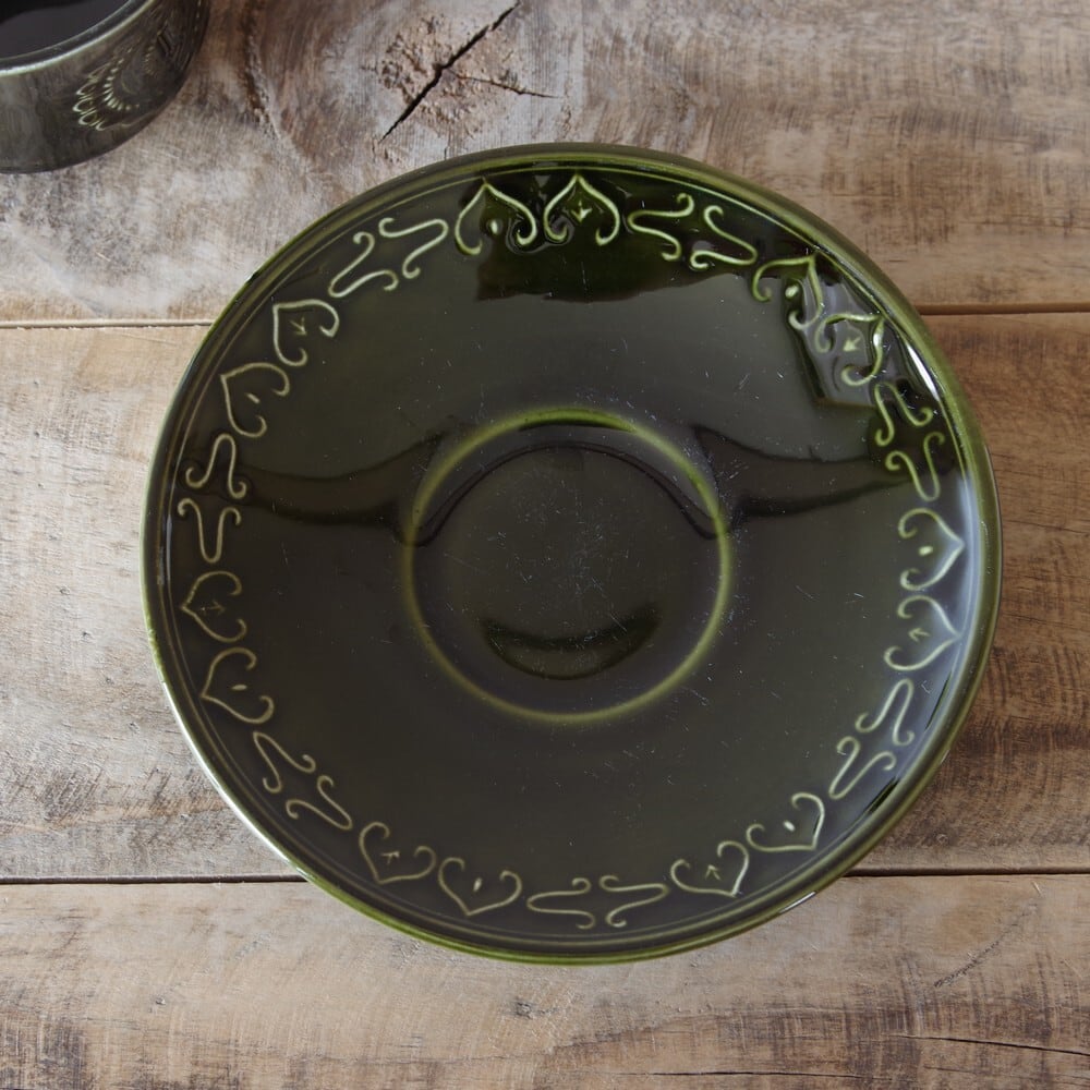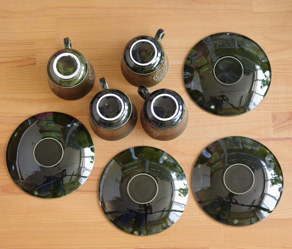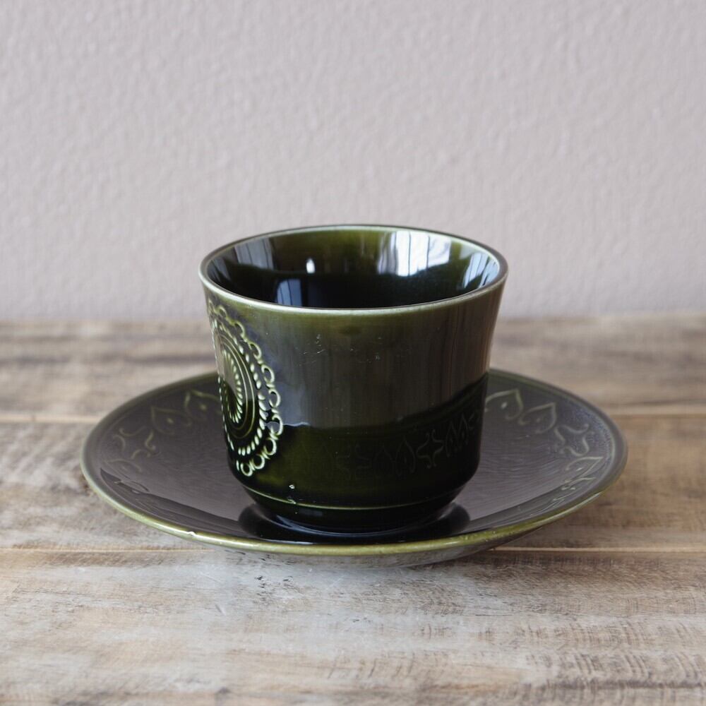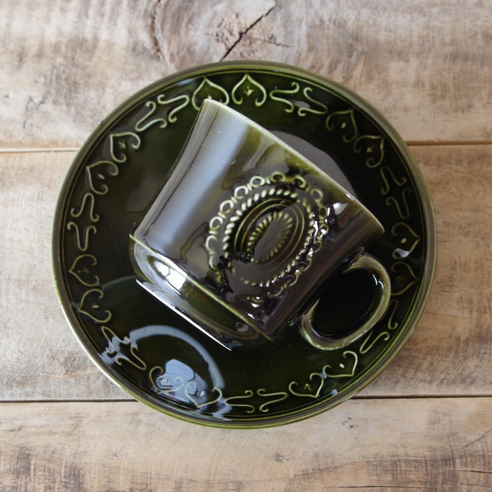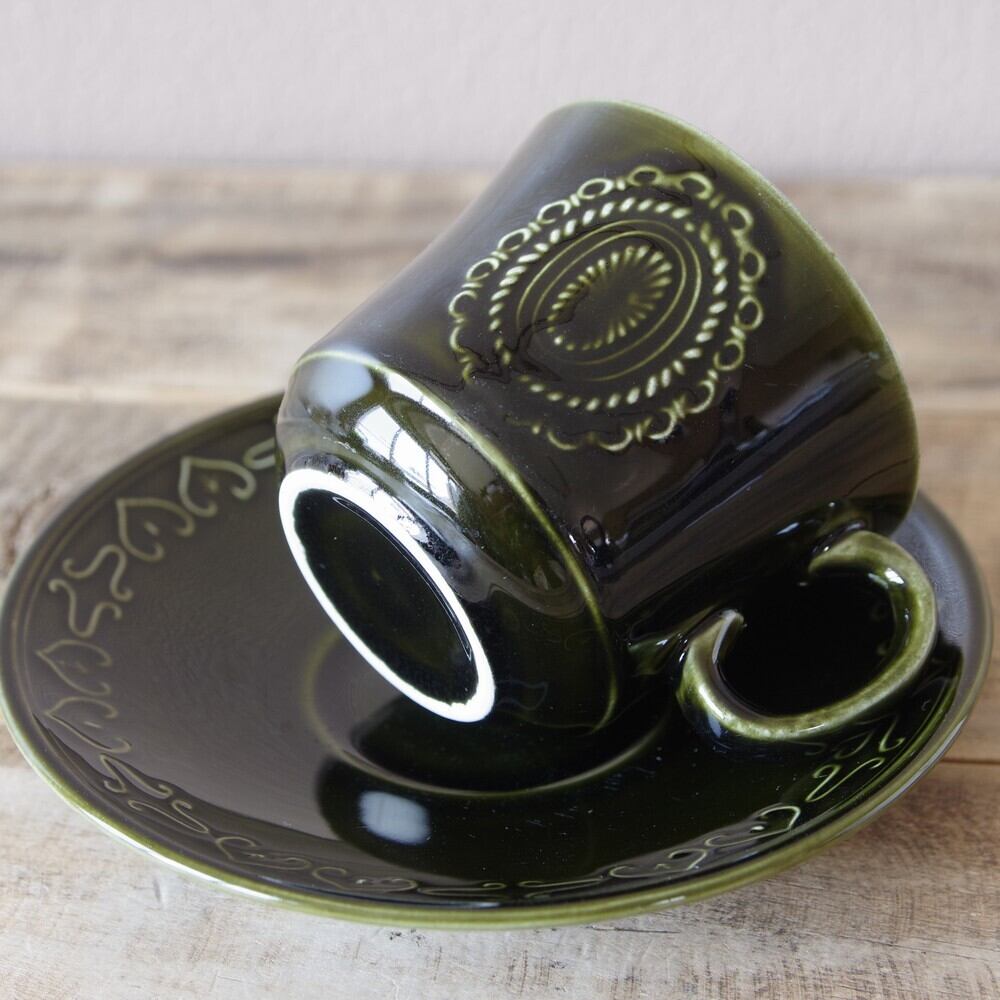 Barratts バラッツ Barbeque バーベキュー グリーン レトロモダン コーヒーカップ ソーサー #200823-1~4 イギリス ビンテージ 食器 陶器 レリーフ アンティーク 深緑