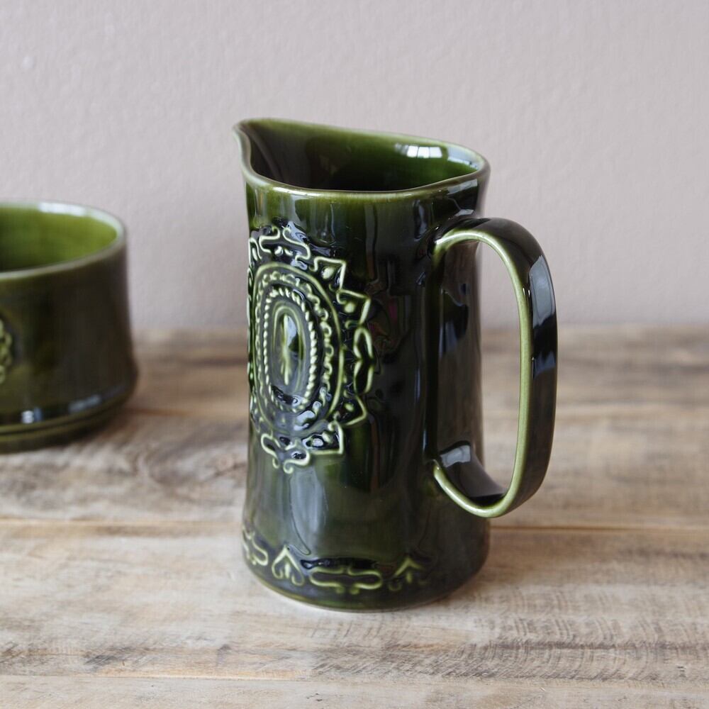 Barratts バラッツ Barbeque バーベキュー グリーン レトロモダン シュガーボウル クリーマー #200823-1~6 イギリス ビンテージ 食器 陶器 レリーフ アンティーク 深緑
